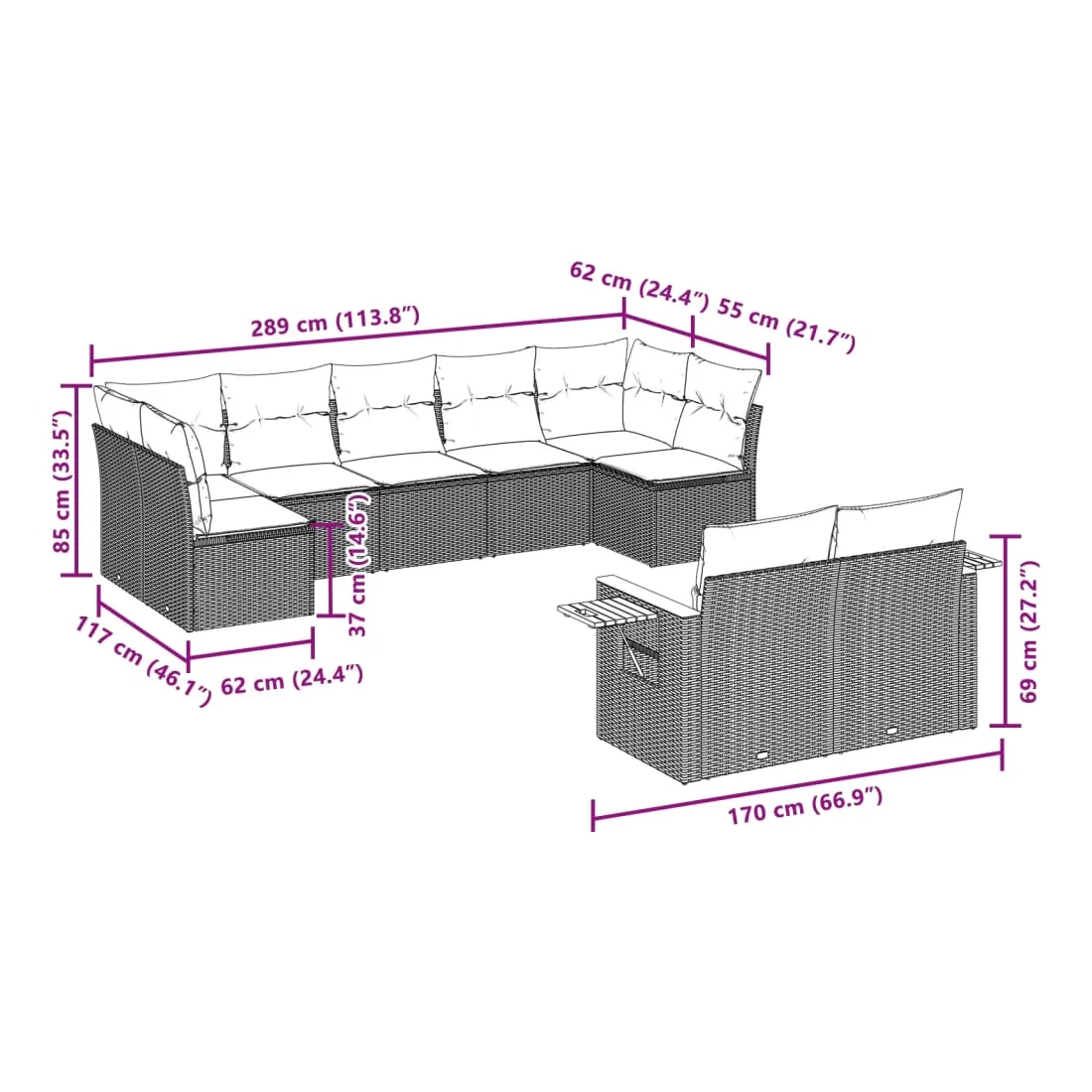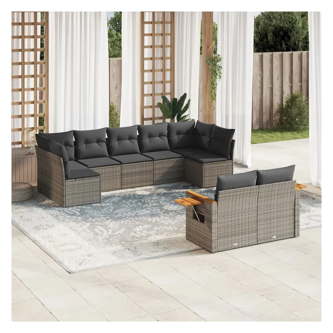 Cet ensemble de canapés de jardin est le complément parfait de votre arrière-cour, terrasse ou patio, offrant un espace confortable et accueillant pour discuter avec la famille et les amis ou simplement se détendre et profiter de l'extérieur. Matériau durable : la résine tressée, également connue sous le nom de poly rotin, est un matériau synthétique solide et nécessitant peu d'entretien qui ressemble au rotin naturel. Il est léger, facile à nettoyer et couramment utilisé pour les meubles d'extérieur en raison de sa durabilité et de ses propriétés de résistance aux intempéries.Fonction de rangement avec sac résistant à l'eau : le mobilier de jardin dispose d'un espace de rangement sous l'assise, complété par un sac résistant à l'eau pour ranger coussins, jouets et autres objets. Le sac intérieur peut être solidement fixé au mobilier d'extérieur grâce à des attaches auto-agrippantes pour plus de stabilité.Table d'appoint pratique : ce mobilier d'extérieur comprend une table d'appoint pliable avec un ressort à gaz sur les accoudoirs, offrant un endroit pratique pour garder vos essentiels à portée de main.Housse amovible et lavable : ces coussins de siège sont dotés de housses amovibles pour un lavage et un entretien faciles.Conception modulaire : cet ensemble de meubles d'extérieur a une conception modulaire, ce qui le rend complètement flexible et facile à déplacer, afin que vous puissiez créer un agencement de meubles d'extérieur personnalisé. Bon à savoir :Pour que vos meubles d'extérieur restent beaux, nous vous recommandons de les protéger avec une housse imperméable.