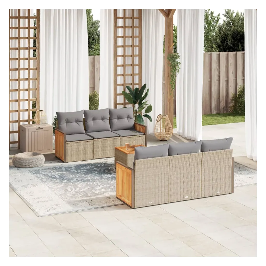 Cet ensemble de canapés de jardin est le complément parfait de votre arrière-cour, terrasse ou patio, offrant un espace confortable et accueillant pour discuter avec la famille et les amis ou simplement se détendre et profiter de l'extérieur. Matériau durable : la résine tressée, également connue sous le nom de poly rotin, est un matériau synthétique solide et nécessitant peu d'entretien qui ressemble au rotin naturel. Il est léger, facile à nettoyer et couramment utilisé pour les meubles d'extérieur en raison de sa durabilité et de ses propriétés de résistance aux intempéries.Fonction de rangement avec sac résistant à l'eau : le mobilier de jardin dispose d'un espace de rangement sous l'assise, complété par un sac résistant à l'eau pour ranger coussins, jouets et autres objets. Le sac intérieur peut être solidement fixé au mobilier d'extérieur grâce à des attaches auto-agrippantes pour plus de stabilité.Dessus stable et facile à nettoyer : cette table de jardin a un dessus en bois d'acacia robuste, durable et facile à nettoyer avec un chiffon humide.Housse amovible et lavable : ces coussins de siège sont dotés de housses amovibles pour un lavage et un entretien faciles.Conception modulaire : cet ensemble de meubles d'extérieur a une conception modulaire, ce qui le rend complètement flexible et facile à déplacer, afin que vous puissiez créer un agencement de meubles d'extérieur personnalisé. Bon à savoir :Pour que vos meubles d'extérieur restent beaux, nous vous recommandons de les protéger avec une housse imperméable.