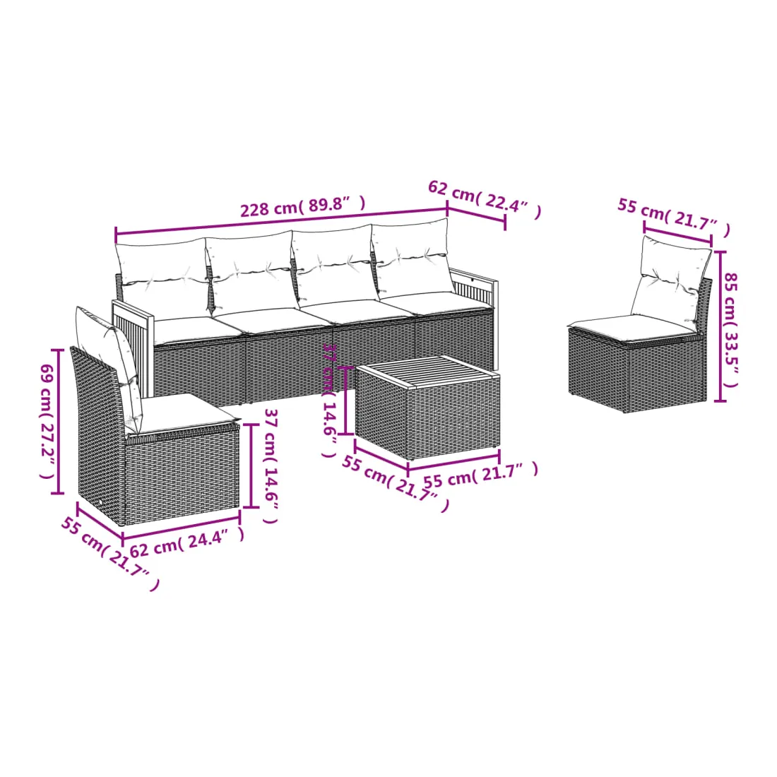 - 6 x coussin de siège avec housse amovible et lavable