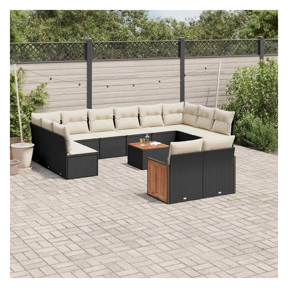 Cet ensemble de canapés de jardin est le complément parfait de votre arrière-cour, terrasse ou patio, offrant un espace confortable et accueillant pour discuter avec la famille et les amis ou simplement se détendre et profiter de l'extérieur. Matériau durable : la résine tressée, également connue sous le nom de poly rotin, est un matériau synthétique solide et nécessitant peu d'entretien qui ressemble au rotin naturel. Il est léger, facile à nettoyer et couramment utilisé pour les meubles d'extérieur en raison de sa durabilité et de ses propriétés de résistance aux intempéries.Fonction de rangement avec sac résistant à l'eau : le mobilier de jardin dispose d'un espace de rangement sous l'assise, complété par un sac résistant à l'eau pour ranger coussins, jouets et autres objets. Le sac intérieur peut être solidement fixé au mobilier d'extérieur grâce à des attaches auto-agrippantes pour plus de stabilité.Dessus stable et facile à nettoyer : cette table de jardin a un dessus en bois d'acacia robuste, durable et facile à nettoyer avec un chiffon humide.Housse amovible et lavable : ces coussins de siège sont dotés de housses amovibles pour un lavage et un entretien faciles.Conception modulaire : cet ensemble de meubles d'extérieur a une conception modulaire, ce qui le rend complètement flexible et facile à déplacer, afin que vous puissiez créer un agencement de meubles d'extérieur personnalisé. Bon à savoir :Pour que vos meubles d'extérieur restent beaux, nous vous recommandons de les protéger avec une housse imperméable.