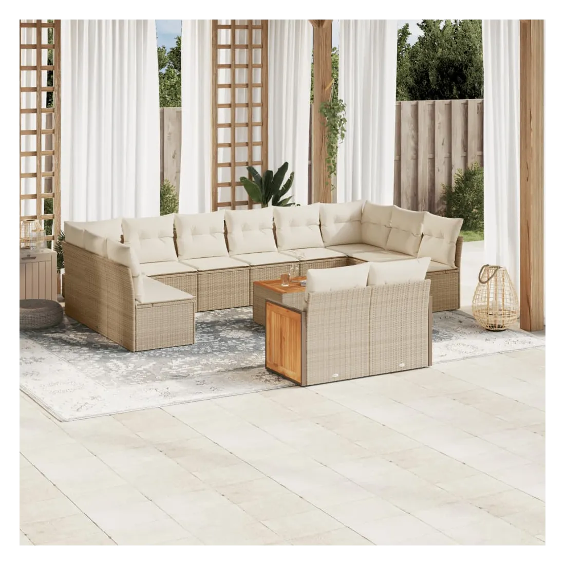 Cet ensemble de canapés de jardin est le complément parfait de votre arrière-cour, terrasse ou patio, offrant un espace confortable et accueillant pour discuter avec la famille et les amis ou simplement se détendre et profiter de l'extérieur. Matériau durable : la résine tressée, également connue sous le nom de poly rotin, est un matériau synthétique solide et nécessitant peu d'entretien qui ressemble au rotin naturel. Il est léger, facile à nettoyer et couramment utilisé pour les meubles d'extérieur en raison de sa durabilité et de ses propriétés de résistance aux intempéries.Fonction de rangement avec sac résistant à l'eau : le mobilier de jardin dispose d'un espace de rangement sous l'assise, complété par un sac résistant à l'eau pour ranger coussins, jouets et autres objets. Le sac intérieur peut être solidement fixé au mobilier d'extérieur grâce à des attaches auto-agrippantes pour plus de stabilité.Dessus stable et facile à nettoyer : cette table de jardin a un dessus en bois d'acacia robuste, durable et facile à nettoyer avec un chiffon humide.Housse amovible et lavable : ces coussins de siège sont dotés de housses amovibles pour un lavage et un entretien faciles.Conception modulaire : cet ensemble de meubles d'extérieur a une conception modulaire, ce qui le rend complètement flexible et facile à déplacer, afin que vous puissiez créer un agencement de meubles d'extérieur personnalisé. Bon à savoir :Pour que vos meubles d'extérieur restent beaux, nous vous recommandons de les protéger avec une housse imperméable.