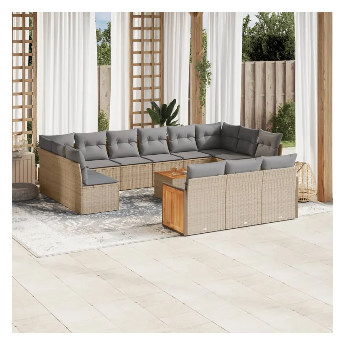 Cet ensemble de canapés de jardin est le complément parfait de votre arrière-cour, terrasse ou patio, offrant un espace confortable et accueillant pour discuter avec la famille et les amis ou simplement se détendre et profiter de l'extérieur. Matériau durable : la résine tressée, également connue sous le nom de poly rotin, est un matériau synthétique solide et nécessitant peu d'entretien qui ressemble au rotin naturel. Il est léger, facile à nettoyer et couramment utilisé pour les meubles d'extérieur en raison de sa durabilité et de ses propriétés de résistance aux intempéries.Fonction de rangement avec sac résistant à l'eau : le mobilier de jardin dispose d'un espace de rangement sous l'assise, complété par un sac résistant à l'eau pour ranger coussins, jouets et autres objets. Le sac intérieur peut être solidement fixé au mobilier d'extérieur grâce à des attaches auto-agrippantes pour plus de stabilité.Dessus stable et facile à nettoyer : cette table de jardin a un dessus en bois d'acacia robuste, durable et facile à nettoyer avec un chiffon humide.Housse amovible et lavable : ces coussins de siège sont dotés de housses amovibles pour un lavage et un entretien faciles.Conception modulaire : cet ensemble de meubles d'extérieur a une conception modulaire, ce qui le rend complètement flexible et facile à déplacer, afin que vous puissiez créer un agencement de meubles d'extérieur personnalisé. Bon à savoir :Pour que vos meubles d'extérieur restent beaux, nous vous recommandons de les protéger avec une housse imperméable.