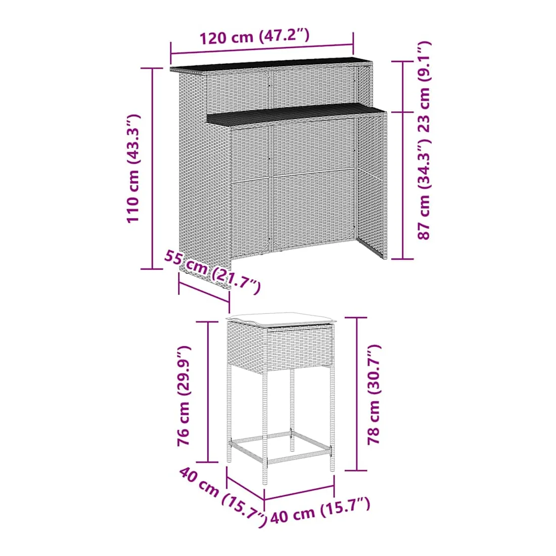 vidaXLCet ensemble de bar de jardin tendance, combinant à la fois style et fonctionnalité, est sûrement destiné à être la pièce maîtresse de votre jardin, terrasse et de tout autre espace de vie. Matériau durable : la résine tressée, également connue sous le nom de poly rotin, est un matériau synthétique solide et nécessitant peu d'entretien qui ressemble au rotin naturel. Elle est légère, facile à nettoyer et couramment utilisée pour les meubles d'extérieur en raison de sa durabilité et de ses propriétés de résistance aux intempéries.Expérience d'assise confortable : ce mobilier d'extérieur, doté de coussins épais, offre une expérience d'assise confortable.Housse amovible et lavable : ces coussins de siège sont dotés de housses amovibles pour un lavage et un entretien faciles.Cadre robuste et stable : le cadre en acier enduit de poudre assure la solidité et la stabilité du meuble de jardin pour une utilisation quotidienne à l'extérieur. Bon à savoir :Pour que vos meubles d'extérieur restent beaux, nous vous recommandons de les protéger avec une housse imperméable.