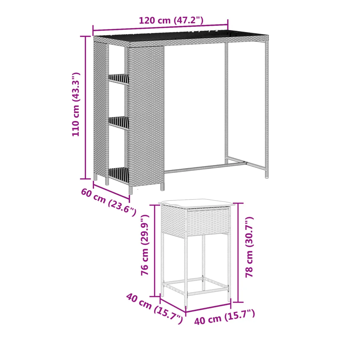 vidaXLCet ensemble de bar de jardin tendance, combinant à la fois style et fonctionnalité, est sûrement destiné à être la pièce maîtresse de votre jardin, terrasse et de tout autre espace de vie. Matériau durable : la résine tressée, également connue sous le nom de poly rotin, est un matériau synthétique solide et nécessitant peu d'entretien qui ressemble au rotin naturel. Elle est légère, facile à nettoyer et couramment utilisée pour les meubles d'extérieur en raison de sa durabilité et de ses propriétés de résistance aux intempéries.Expérience d'assise confortable : ce mobilier d'extérieur, doté de coussins épais, offre une expérience d'assise confortable.Housse amovible et lavable : ces coussins de siège sont dotés de housses amovibles pour un lavage et un entretien faciles.Cadre robuste et stable : le cadre en acier enduit de poudre assure la solidité et la stabilité du meuble de jardin pour une utilisation quotidienne à l'extérieur. Bon à savoir :Pour que vos meubles d'extérieur restent beaux, nous vous recommandons de les protéger avec une housse imperméable.