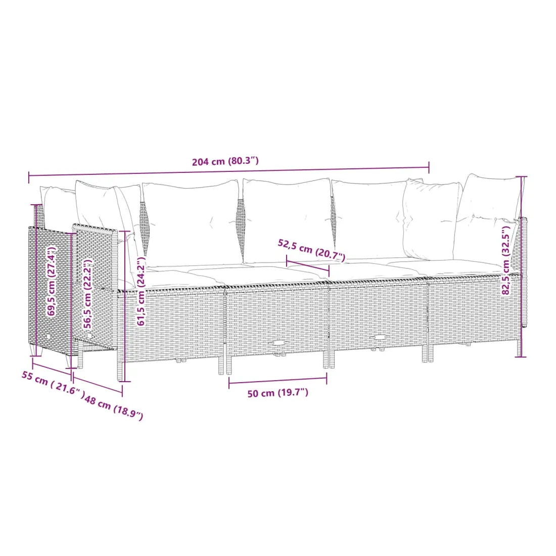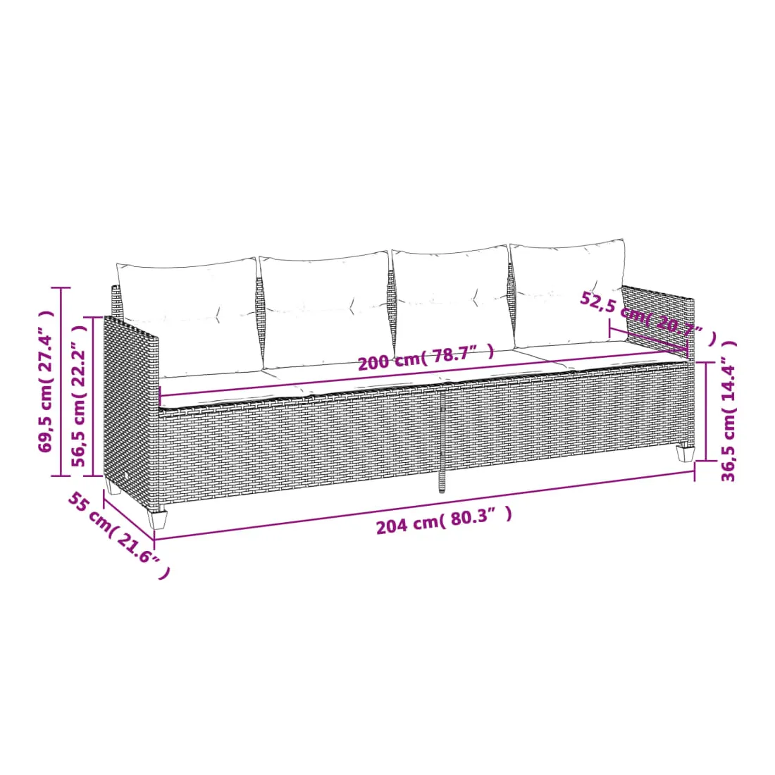 - Taille du coussin d’assise (canapé 4 places) : 200 x 52,5 x 3 cm (l x P x é)