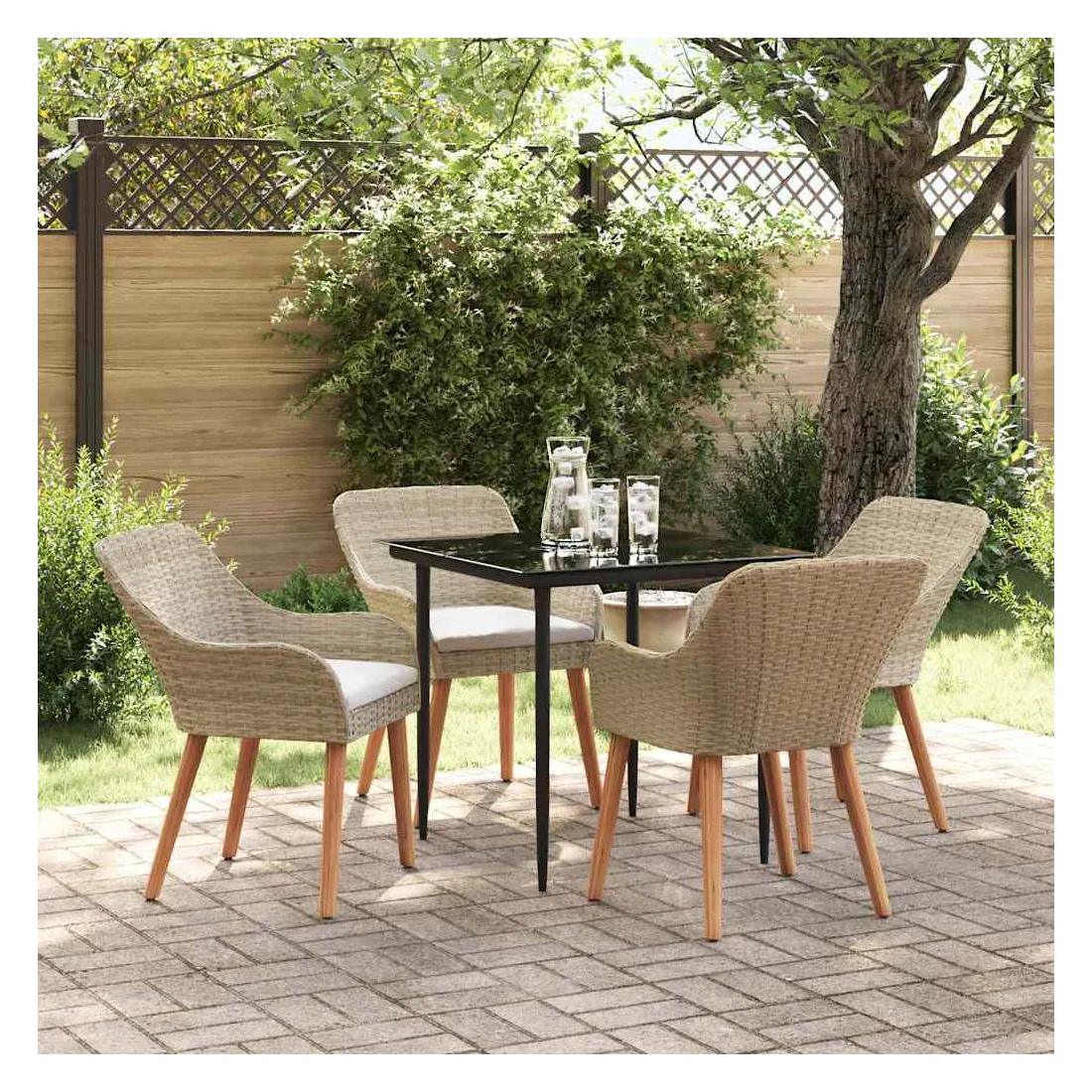 Le set de salle à manger de jardin est un super ajout à n'importe quel espace extérieur, avec un style moderne et des lignes épurées qui attirent l'œil. Réalisé pour ceux qui veulent le meilleur, cet ensemble allie perfection et style, idéal pour passer de bons moments dans votre jardin ou sur votre terrasse. Son look chic transforme votre extérieur en un endroit cool pour dîner et se relaxer. Matériau en poly rattan : Le set de salle à manger pour le jardin est fait en poly rattan, connu pour sa durabilité et son faible entretien. Ce matériau résiste aux intempéries, ce qui garantit que votre ensemble reste beau même après une utilisation extérieure. La texture du rattan apporte une touche classe à tout ensemble de jardin. Surface en verre trempé : La table est recouverte de verre trempé, ce qui offre une expérience de repas lisse. Le verre est facile à nettoyer, reste clair malgré le temps qu'il fait et ajoute une finition moderne qui complète bien le rattan. Confort total : Cet ensemble vient avec des coussins rembourrés conçus pour l'extérieur et résistants au mauvais temps, garantissant du confort même par temps difficile. Pensés pour le bien-être, les coussins s'adaptent bien aux chaises et visent à maximiser votre confort. Composants pratiques : La finition du dossier en poly rattan, avec des accoudoirs stables, crée une ambiance accueillante et ergonomique. Chaque élément a été soigneusement intégré pour rendre vos repas inoubliables. Entretien et maintenance : Conçu pour un entretien facile, il suffit de passer un coup de chiffon humide pour garder l'ensemble en top état. On vous conseille d'utiliser une housse étanche pour prolonger sa durabilité et garder son look au fil du temps.