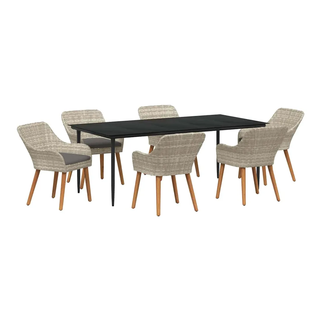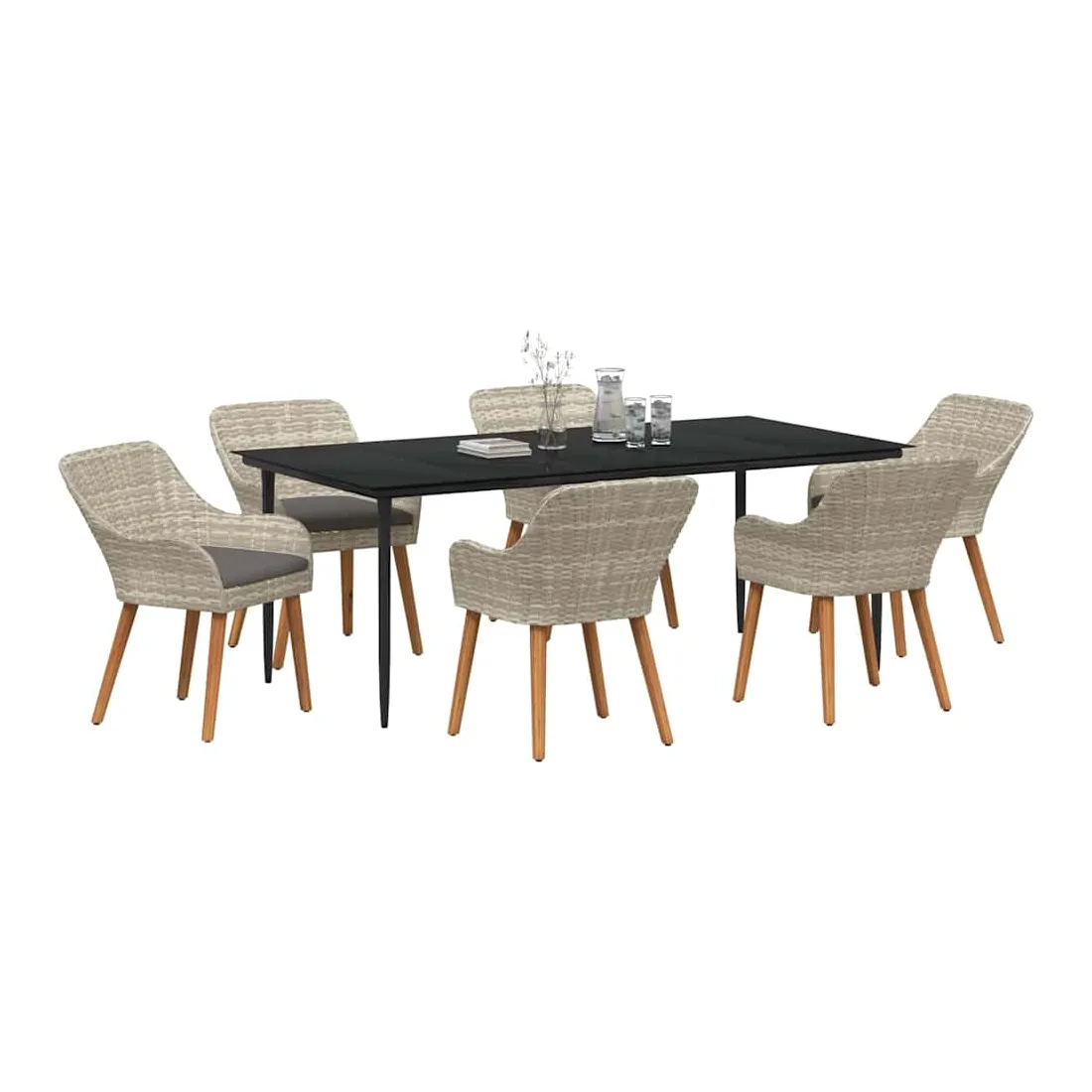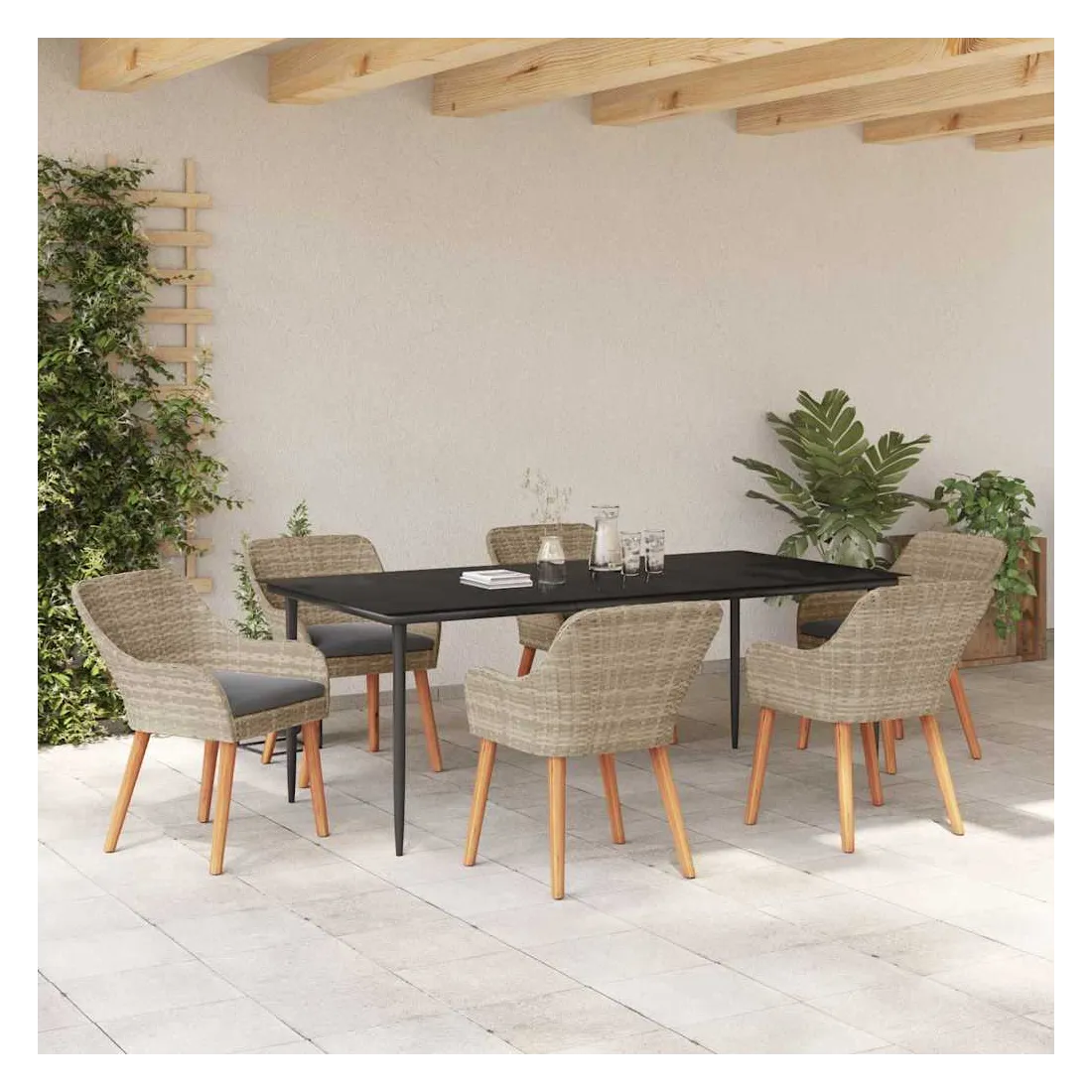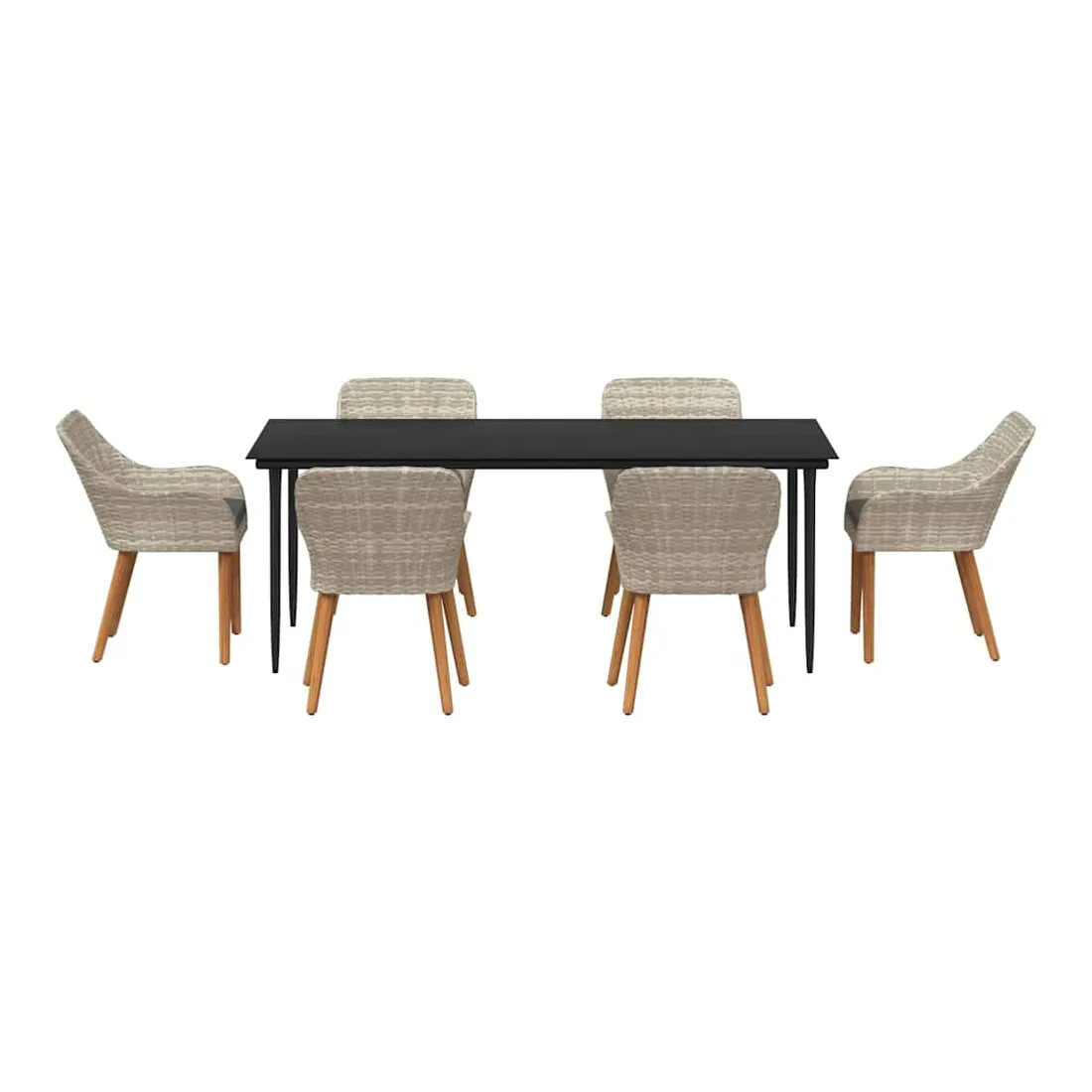 Cet ensemble de jardin moderne propose une solution à la fois actuelle et durable pour manger en extérieur, que ce soit dans le jardin ou sur la terrasse. Ses lignes épurées évoquent un design contemporain avec une large table et des chaises confortables, créant une ambiance conviviale pour vos repas en plein air. Sa finition en poly rattan gris clair s'harmonise parfaitement avec votre espace extérieur, alliant esthétique et fonctionnalité. Matériau qui tient dehors : Fabriqué avec un poly rattan résistant, cet ensemble est fait pour braver la météo, parfait pour le dehors toute l'année. Il résiste aux UV et à l'humidité, garantissant durabilité et entretien facile. Cadre en acier robuste : Fiable et solide, le cadre en acier revêtu de poudre donne une base stable, assurant sécurité durant les repas. Avec une qualité à l'esprit, il résiste bien et prolonge la vie de votre investissement. Coussins confortables : Ces coussins d'extérieur promise du confort sans compromettre leur résistance à la pluie et au soleil. Conçus pour des moments de détente, ils invitent vos invités à s'asseoir, discuter et manger tranquillement. Style moderne : Avec son look en poly rattan gris clair, cet ensemble s'intègre facilement dans tous les styles de décoration extérieure. Son design minimaliste rehausse l'ambiance sans trop charger l'espace, offrant une belle harmonie. Entretien facile : L'entretien est simple avec peu de besoin. Essuyez simplement les surfaces avec un chiffon sec pour que l'ensemble reste lumineux. Des housses de protection peuvent aussi être utilisées pour plus de soin lors de mauvais temps.