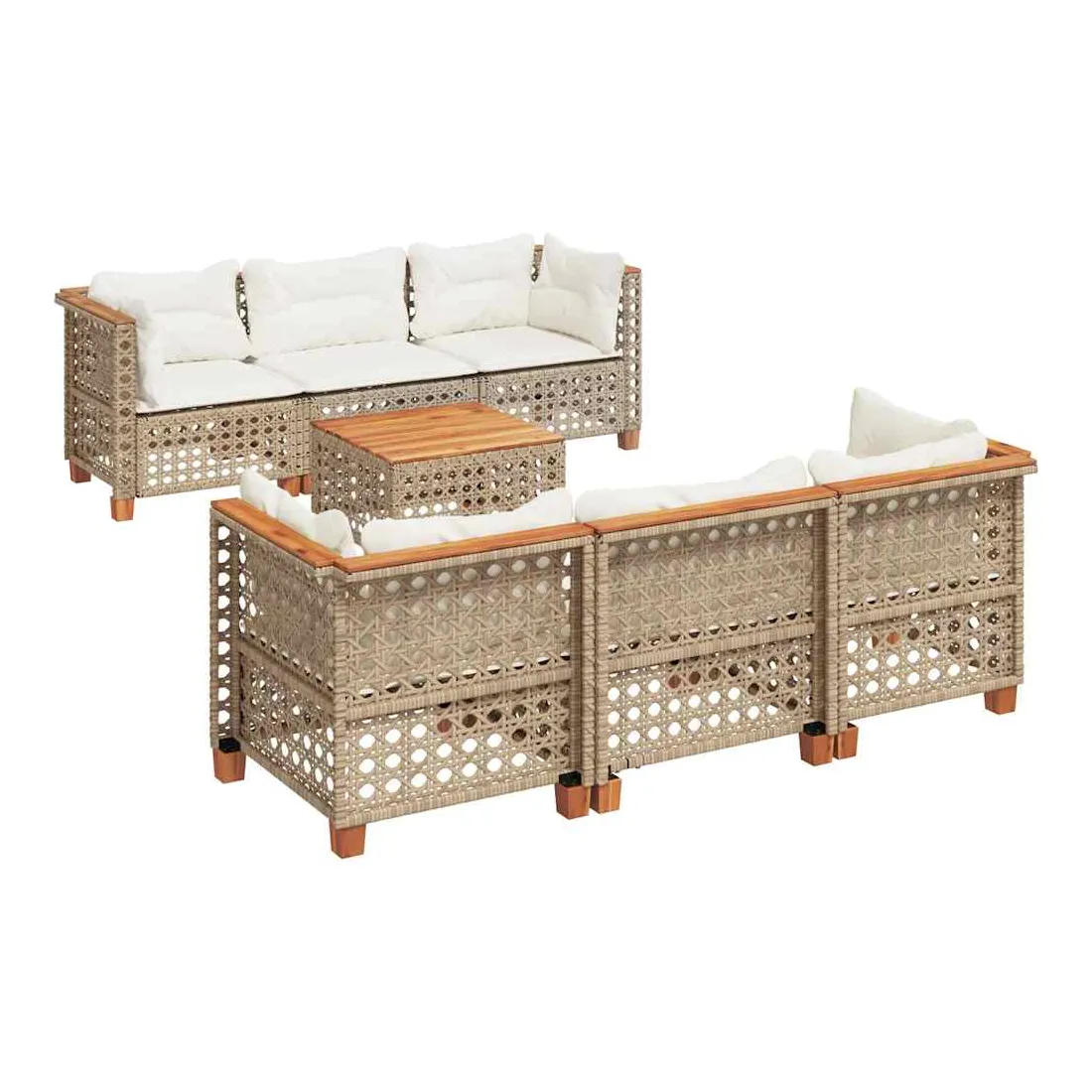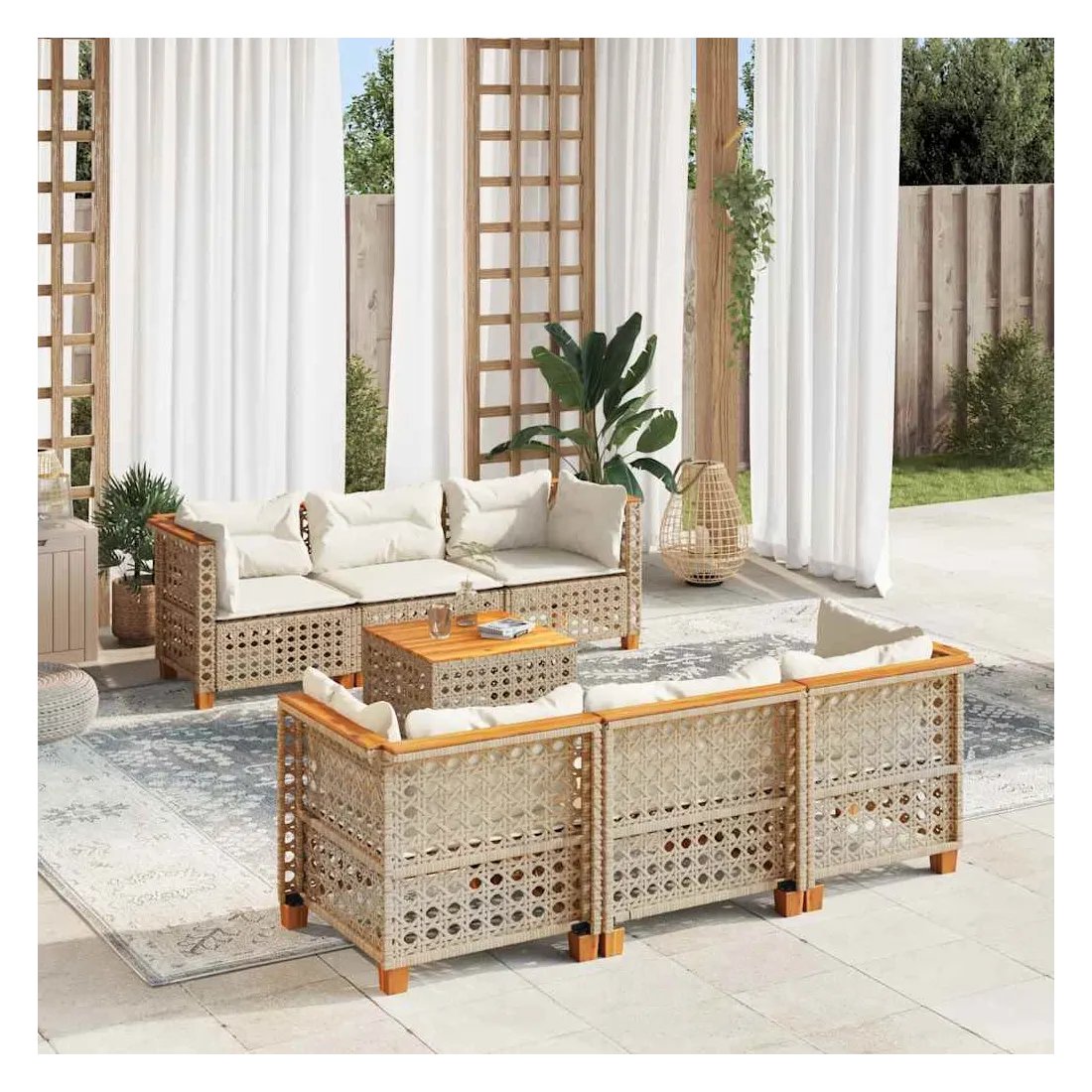 Cet ensemble de canapés de jardin est le complément parfait de votre arrière-cour, terrasse ou patio, offrant un espace confortable et accueillant pour discuter avec la famille et les amis ou simplement se détendre et profiter de l'extérieur. Matériau durable : la résine tressée, également connue sous le nom de poly rotin, est un matériau synthétique solide et nécessitant peu d'entretien qui ressemble au rotin naturel. Elle est légère, facile à nettoyer et couramment utilisée pour les meubles d'extérieur en raison de sa durabilité et de ses propriétés de résistance aux intempéries.Expérience d'assise confortable : ce mobilier d'extérieur, doté de coussins épais, offre une expérience d'assise confortable.Housse amovible et lavable : ces coussins de siège sont dotés de housses amovibles pour un lavage et un entretien faciles.Dessus stable et facile à nettoyer : cette table de jardin a un dessus en bois d'acacia robuste, durable et facile à nettoyer avec un chiffon humide.Conception modulaire : cet ensemble de meubles d'extérieur a une conception modulaire, ce qui le rend complètement flexible et facile à déplacer, afin que vous puissiez créer un agencement de meubles d'extérieur personnalisé. Bon à savoir :Pour que vos meubles d'extérieur restent beaux, nous vous recommandons de les protéger avec une housse imperméable.