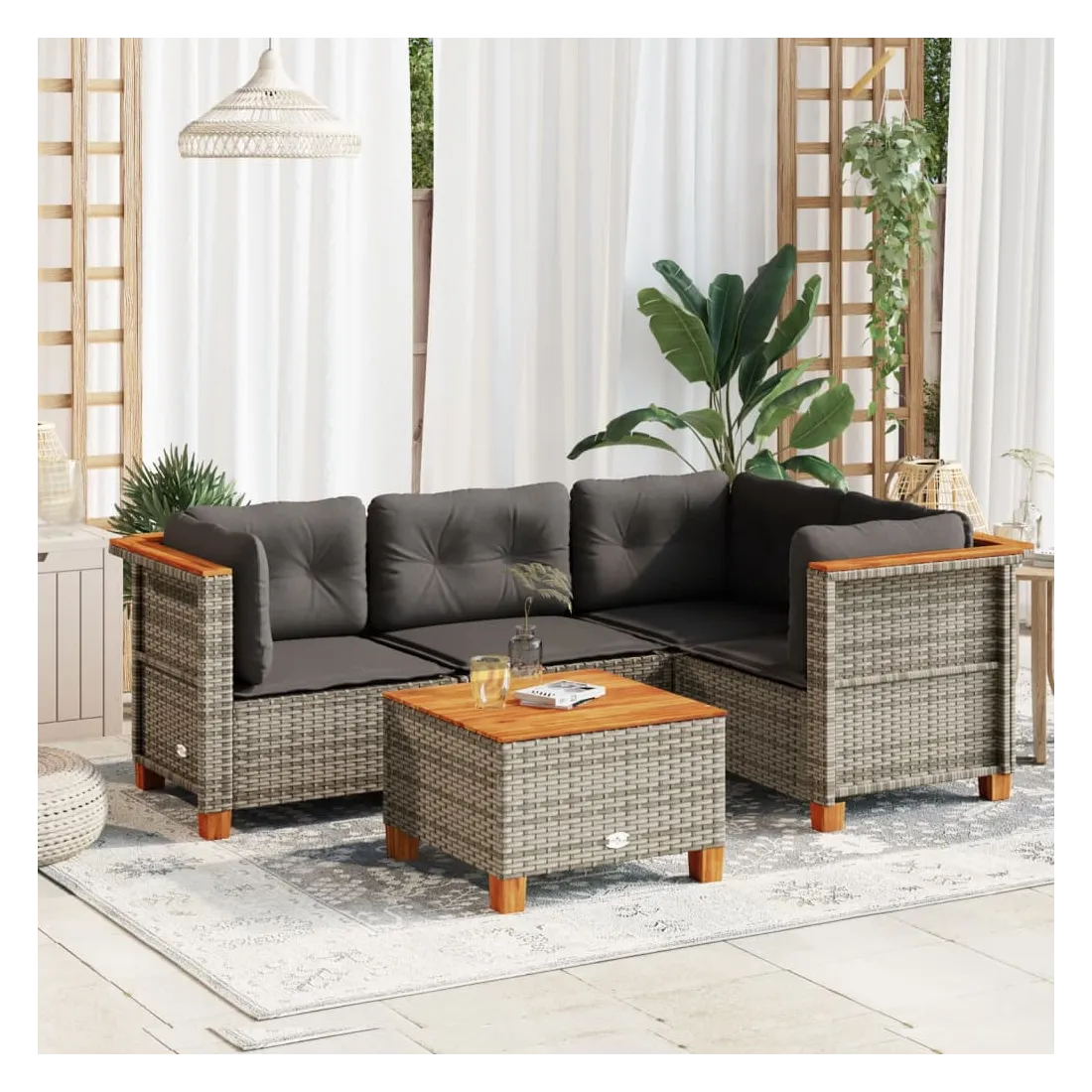 Cet ensemble de canapés de jardin est le complément parfait de votre arrière-cour, terrasse ou patio, offrant un espace confortable et accueillant pour discuter avec la famille et les amis ou simplement se détendre et profiter de l'extérieur. Matériau durable : la résine tressée, également connue sous le nom de poly rotin, est un matériau synthétique solide et nécessitant peu d'entretien qui ressemble au rotin naturel. Il est léger, facile à nettoyer et couramment utilisé pour les meubles d'extérieur en raison de sa durabilité et de ses propriétés de résistance aux intempéries.Expérience d'assise confortable : ce mobilier d'extérieur, doté de coussins épais, offre une expérience d'assise confortable.Housse amovible et lavable : ces coussins de siège sont dotés de housses amovibles pour un lavage et un entretien faciles.Dessus stable et facile à nettoyer : cette table de jardin a un dessus en bois d'acacia robuste, durable et facile à nettoyer avec un chiffon humide.Conception modulaire : cet ensemble de meubles d'extérieur a une conception modulaire, ce qui le rend complètement flexible et facile à déplacer, afin que vous puissiez créer un agencement de meubles d'extérieur personnalisé. Bon à savoir :Pour que vos meubles d'extérieur restent beaux, nous vous recommandons de les protéger avec une housse imperméable.