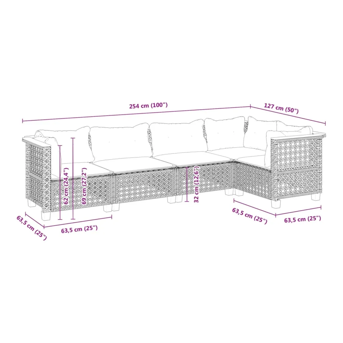 - Dimensions du coussin de dossier (angle) : 63,5 x 35 x 10 cm (L x l x é)