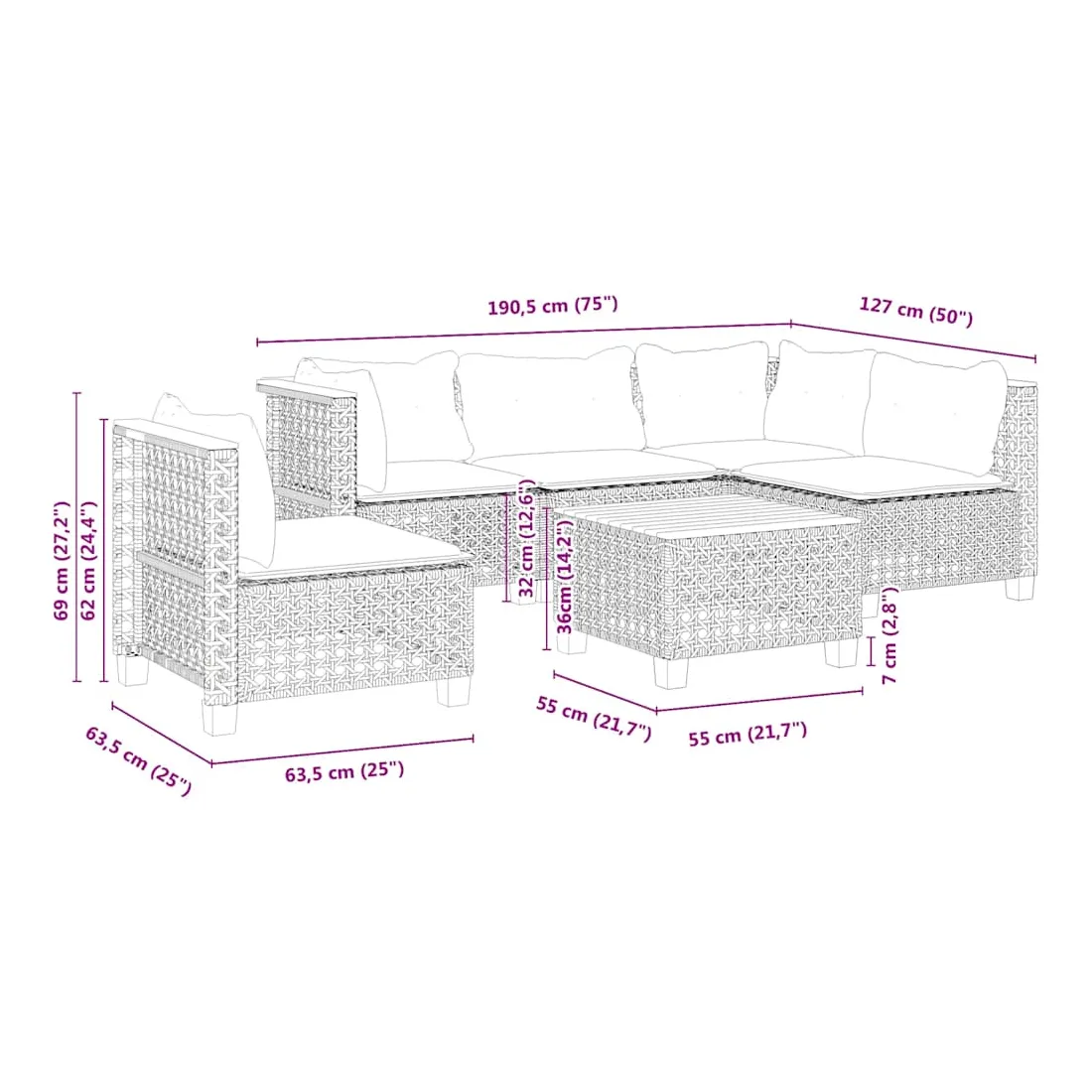 - Dimensions du coussin de dossier (angle) : 63,5 x 35 x 10 cm (L x l x é)