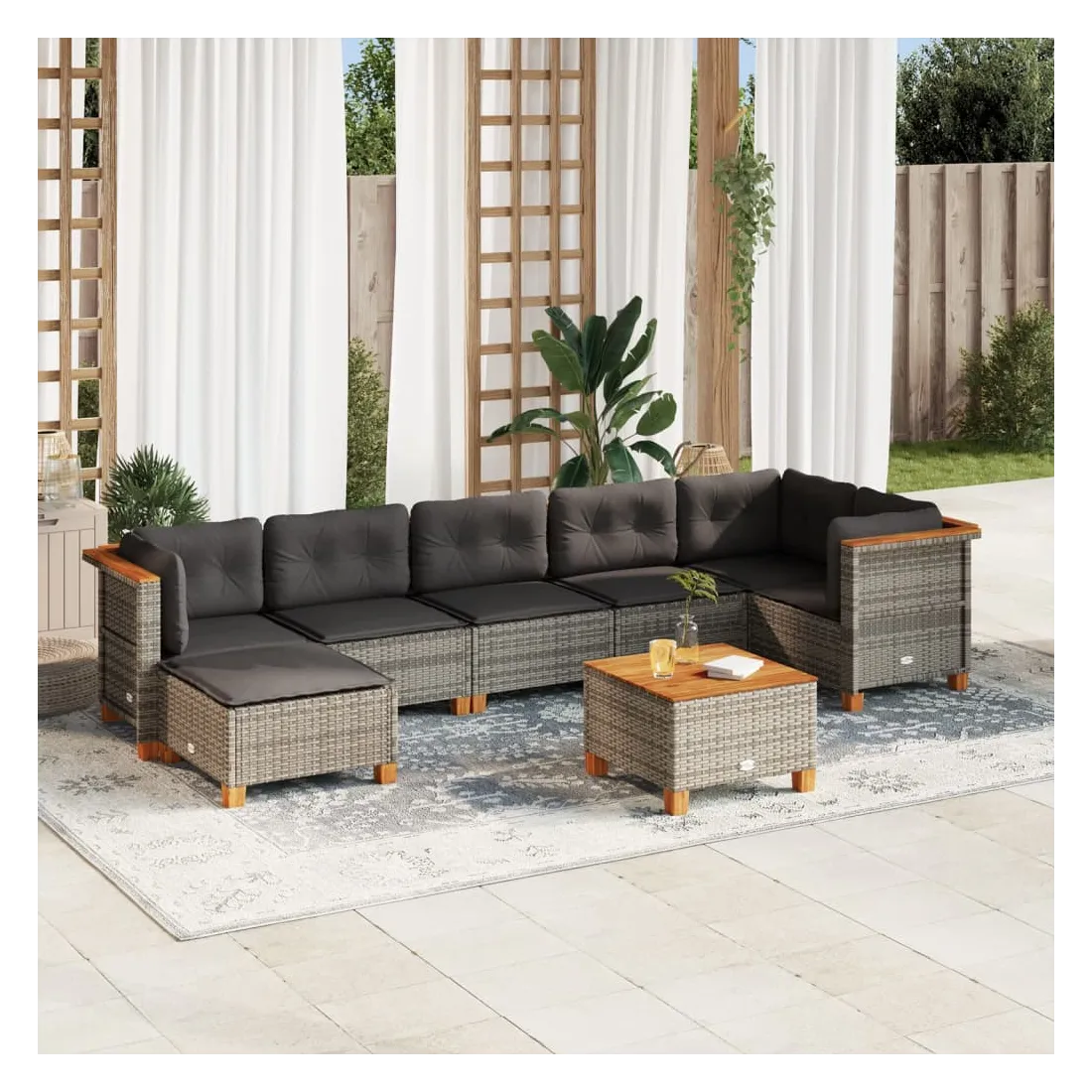 Cet ensemble de canapés de jardin est le complément parfait de votre arrière-cour, terrasse ou patio, offrant un espace confortable et accueillant pour discuter avec la famille et les amis ou simplement se détendre et profiter de l'extérieur. Matériau durable : la résine tressée, également connue sous le nom de poly rotin, est un matériau synthétique solide et nécessitant peu d'entretien qui ressemble au rotin naturel. Il est léger, facile à nettoyer et couramment utilisé pour les meubles d'extérieur en raison de sa durabilité et de ses propriétés de résistance aux intempéries.Expérience d'assise confortable : ce mobilier d'extérieur, doté de coussins épais, offre une expérience d'assise confortable.Housse amovible et lavable : ces coussins de siège sont dotés de housses amovibles pour un lavage et un entretien faciles.Dessus stable et facile à nettoyer : cette table de jardin a un dessus en bois d'acacia robuste, durable et facile à nettoyer avec un chiffon humide.Conception modulaire : cet ensemble de meubles d'extérieur a une conception modulaire, ce qui le rend complètement flexible et facile à déplacer, afin que vous puissiez créer un agencement de meubles d'extérieur personnalisé. Bon à savoir :Pour que vos meubles d'extérieur restent beaux, nous vous recommandons de les protéger avec une housse imperméable.