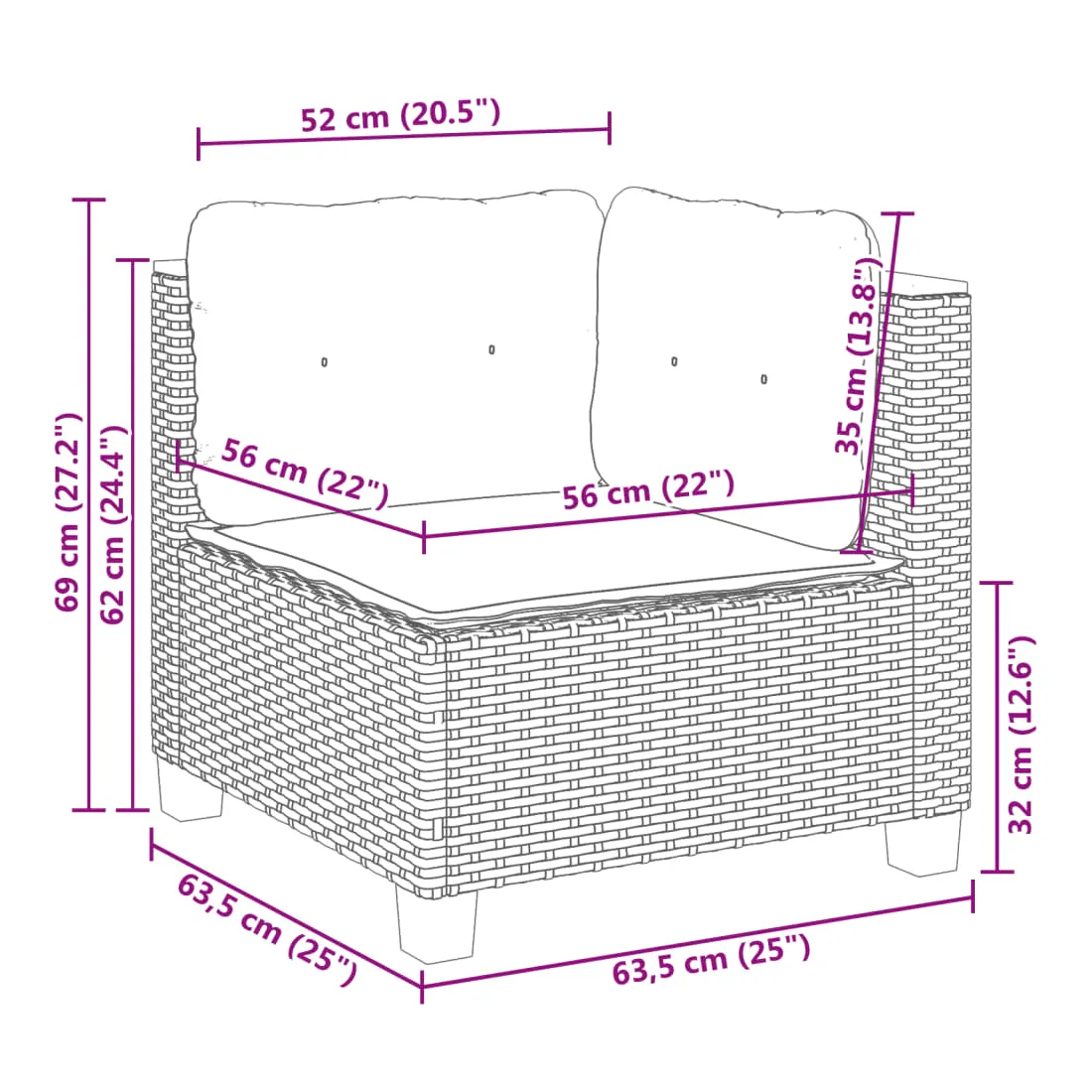 - Dimensions du coussin d’assise (angle) : 56,5 x 56,5 x 3 cm (l x P x é)
