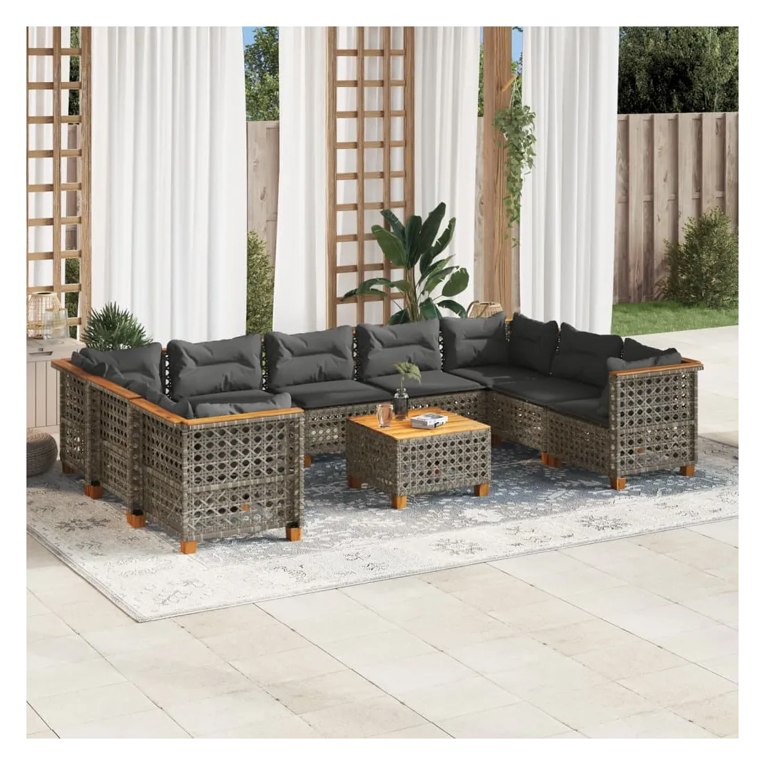 Cet ensemble de canapés de jardin est le complément parfait de votre arrière-cour, terrasse ou patio, offrant un espace confortable et accueillant pour discuter avec la famille et les amis ou simplement se détendre et profiter de l'extérieur. Matériau durable : la résine tressée, également connue sous le nom de poly rotin, est un matériau synthétique solide et nécessitant peu d'entretien qui ressemble au rotin naturel. Il est léger, facile à nettoyer et couramment utilisé pour les meubles d'extérieur en raison de sa durabilité et de ses propriétés de résistance aux intempéries.Expérience d'assise confortable : ce mobilier d'extérieur, doté de coussins épais, offre une expérience d'assise confortable.Housse amovible et lavable : ces coussins de siège sont dotés de housses amovibles pour un lavage et un entretien faciles.Dessus stable et facile à nettoyer : cette table de jardin a un dessus en bois d'acacia robuste, durable et facile à nettoyer avec un chiffon humide.Conception modulaire : cet ensemble de meubles d'extérieur a une conception modulaire, ce qui le rend complètement flexible et facile à déplacer, afin que vous puissiez créer un agencement de meubles d'extérieur personnalisé. Bon à savoir :Pour que vos meubles d'extérieur restent beaux, nous vous recommandons de les protéger avec une housse imperméable.