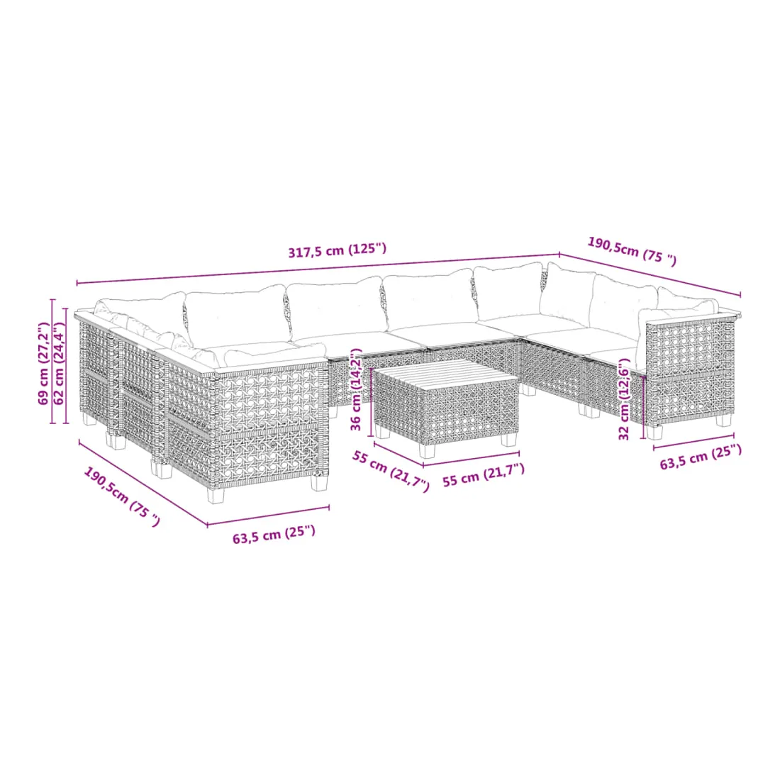 • Dimensions du coussin de dossier (angle) : 63,5 x 35 x 10 cm (L x l x é)