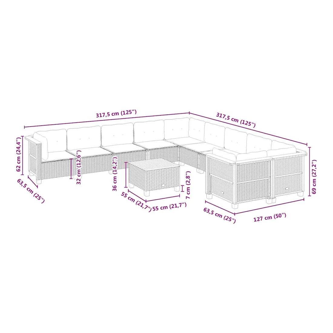 - Dimensions du coussin d’assise (angle) : 56,5 x 56,5 x 3 cm (l x P x é)