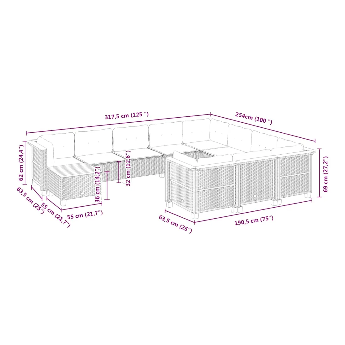 • Dimensions du coussin de dossier (angle) : 63,5 x 35 x 10 cm (L x l x é)
