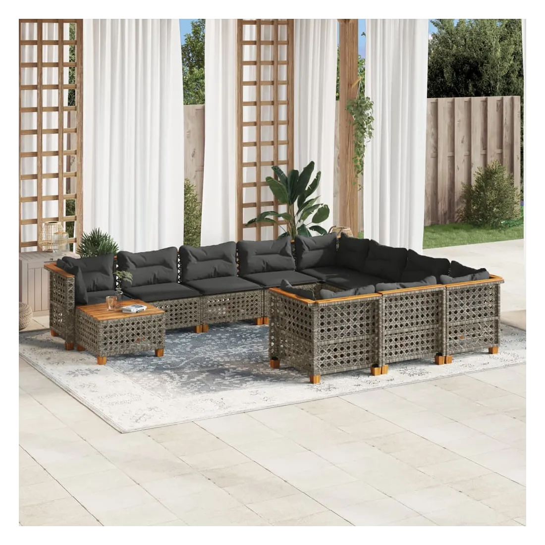 Cet ensemble de canapés de jardin est le complément parfait de votre arrière-cour, terrasse ou patio, offrant un espace confortable et accueillant pour discuter avec la famille et les amis ou simplement se détendre et profiter de l'extérieur. Matériau durable : la résine tressée, également connue sous le nom de poly rotin, est un matériau synthétique solide et nécessitant peu d'entretien qui ressemble au rotin naturel. Il est léger, facile à nettoyer et couramment utilisé pour les meubles d'extérieur en raison de sa durabilité et de ses propriétés de résistance aux intempéries.Expérience d'assise confortable : ce mobilier d'extérieur, doté de coussins épais, offre une expérience d'assise confortable.Housse amovible et lavable : ces coussins de siège sont dotés de housses amovibles pour un lavage et un entretien faciles.Dessus stable et facile à nettoyer : cette table de jardin a un dessus en bois d'acacia robuste, durable et facile à nettoyer avec un chiffon humide.Conception modulaire : cet ensemble de meubles d'extérieur a une conception modulaire, ce qui le rend complètement flexible et facile à déplacer, afin que vous puissiez créer un agencement de meubles d'extérieur personnalisé. Bon à savoir :Pour que vos meubles d'extérieur restent beaux, nous vous recommandons de les protéger avec une housse imperméable.