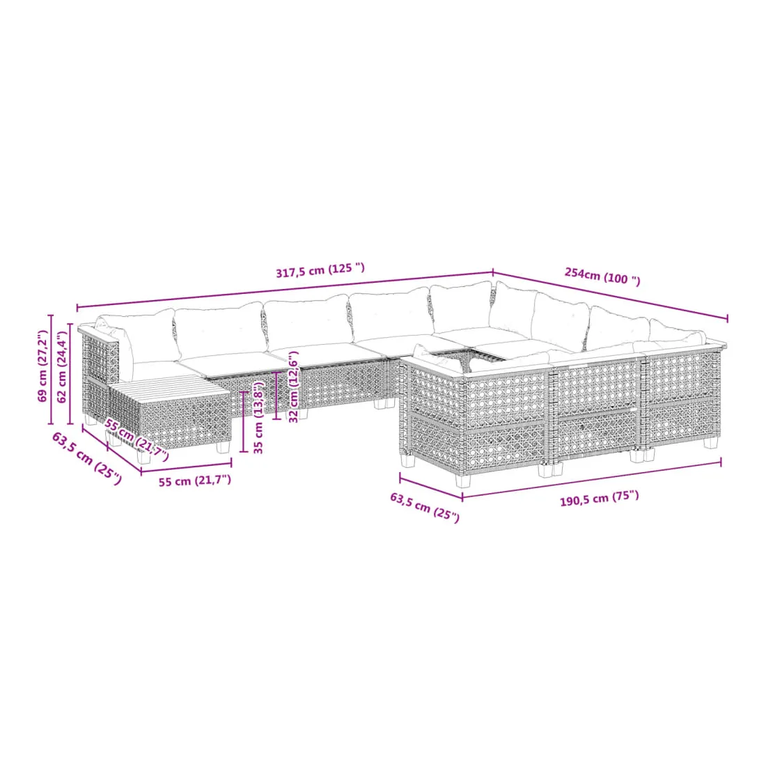 • Dimensions du coussin de dossier (angle) : 63,5 x 35 x 10 cm (L x l x é)
