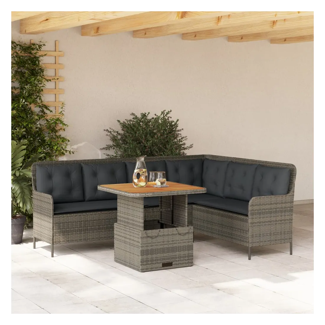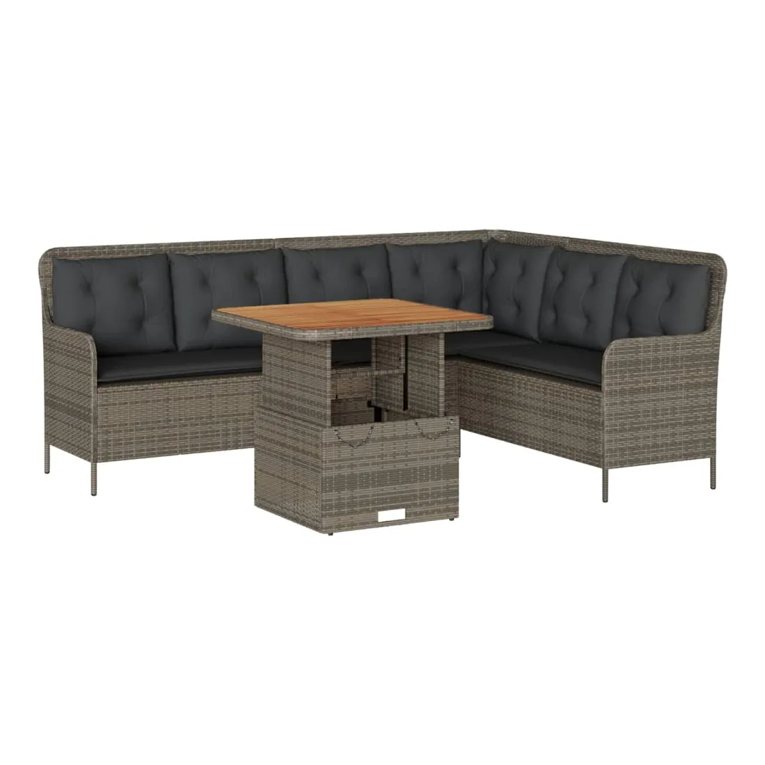 Cet ensemble de canapés de jardin est le complément parfait de votre arrière-cour, terrasse ou patio, offrant un espace confortable et accueillant pour discuter avec la famille et les amis ou simplement se détendre et profiter de l'extérieur. Matériau durable : la résine tressée, également connue sous le nom de poly rotin, est un matériau synthétique solide et nécessitant peu d'entretien qui ressemble au rotin naturel. Elle est légère, facile à nettoyer et couramment utilisée pour les meubles d'extérieur en raison de sa durabilité et de ses propriétés de résistance aux intempéries.Expérience d'assise confortable : ce mobilier d'extérieur, doté de coussins épais, offre une expérience d'assise confortable.Housse amovible et lavable : ces coussins de siège sont dotés de housses amovibles pour un lavage et un entretien faciles.Dessus de table réglable : le dessus de table peut être soulevé pour rendre la table plus haute, ce qui transforme la table d'extérieur d'une table basse à une table de salle à manger. Elle est parfaite pour recevoir des invités ou prendre des repas à l'extérieur.Dessus stable et facile à nettoyer : cette table de jardin a un dessus en bois d'acacia robuste, durable et facile à nettoyer avec un chiffon humide. Bon à savoir :Pour que vos meubles d'extérieur restent beaux, nous vous recommandons de les protéger avec une housse imperméable.