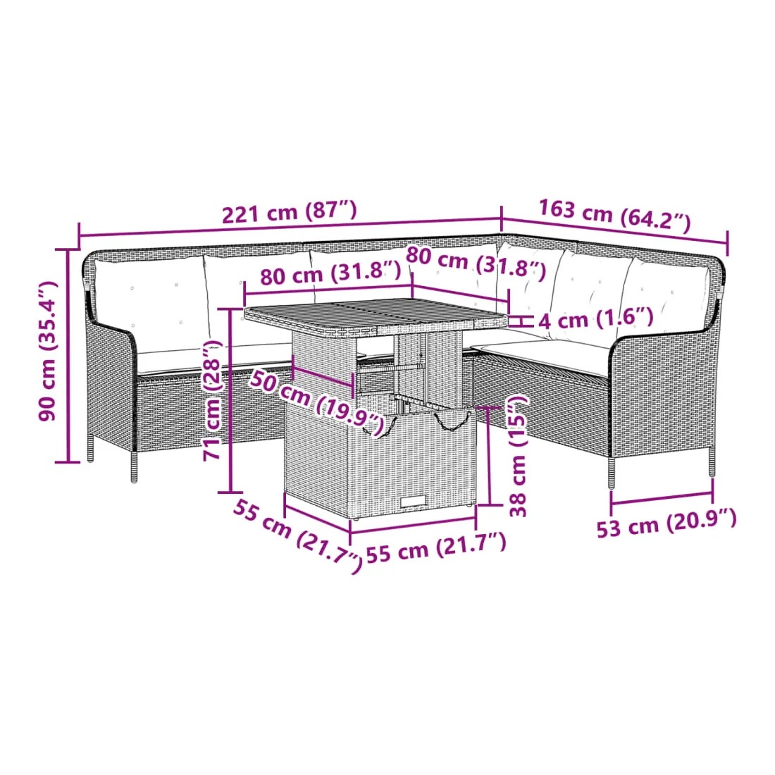 - Dimensions : 80 x 80 x 40/71 cm (L x l x H)