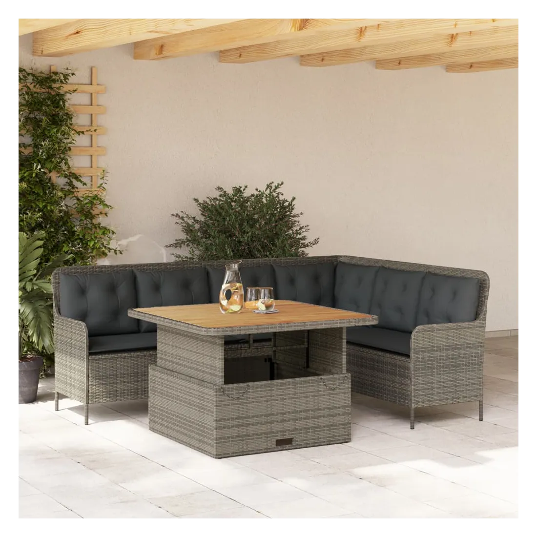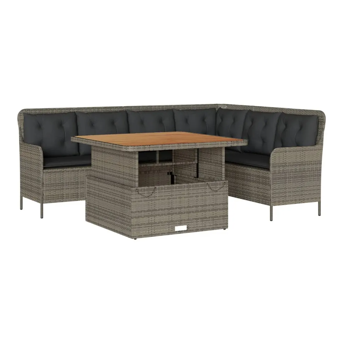 Cet ensemble de canapés de jardin est le complément parfait de votre arrière-cour, terrasse ou patio, offrant un espace confortable et accueillant pour discuter avec la famille et les amis ou simplement se détendre et profiter de l'extérieur. Matériau durable : la résine tressée, également connue sous le nom de poly rotin, est un matériau synthétique solide et nécessitant peu d'entretien qui ressemble au rotin naturel. Elle est légère, facile à nettoyer et couramment utilisée pour les meubles d'extérieur en raison de sa durabilité et de ses propriétés de résistance aux intempéries.Expérience d'assise confortable : ce mobilier d'extérieur, doté de coussins épais, offre une expérience d'assise confortable.Housse amovible et lavable : ces coussins de siège sont dotés de housses amovibles pour un lavage et un entretien faciles.Dessus de table réglable : le dessus de table peut être soulevé pour rendre la table plus haute, ce qui transforme la table d'extérieur d'une table basse à une table de salle à manger. Elle est parfaite pour recevoir des invités ou prendre des repas à l'extérieur.Dessus stable et facile à nettoyer : cette table de jardin a un dessus en bois d'acacia robuste, durable et facile à nettoyer avec un chiffon humide. Bon à savoir :Pour que vos meubles d'extérieur restent beaux, nous vous recommandons de les protéger avec une housse imperméable.