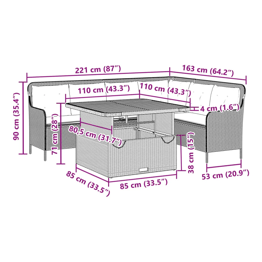 - Dimensions totales : 221 x 163 x 90 cm (l x P x H)