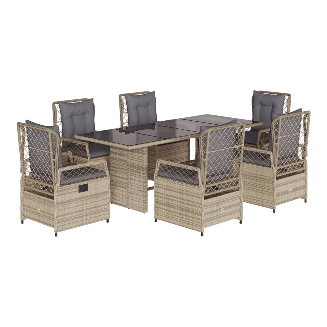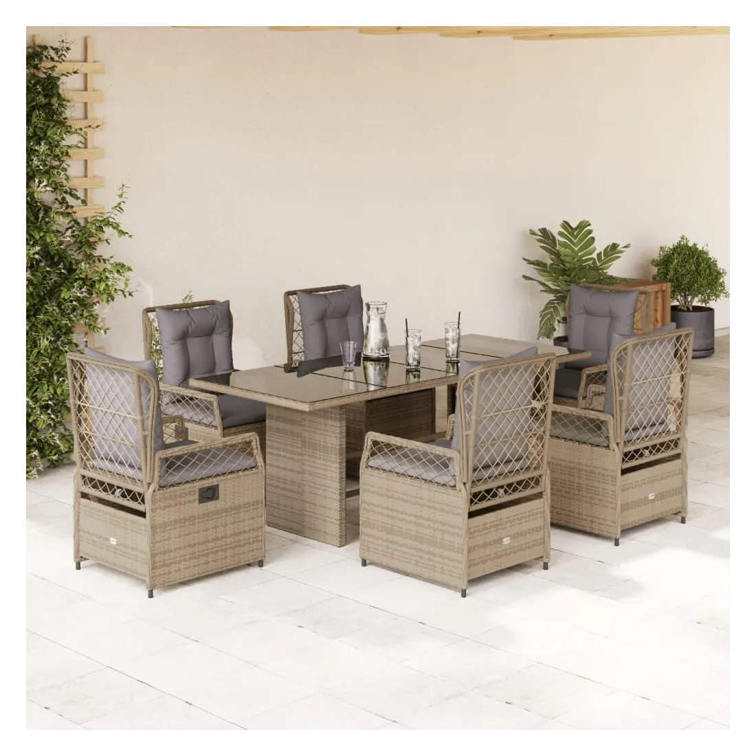 Cet ensemble de salle à manger de jardin est un excellent choix pour les repas en plein air ou pour vous détendre dans le jardin, dans l'arrière-cour ou sur la terrasse. Matériau durable : la résine tressée, également connue sous le nom de poly rotin, est un matériau synthétique solide et nécessitant peu d'entretien qui ressemble au rotin naturel. Il est léger, facile à nettoyer et couramment utilisé pour les meubles d'extérieur en raison de sa durabilité et de ses propriétés de résistance aux intempéries.Dossier réglable : ce siège de jardin est doté d'une poignée. Vous pouvez régler le dossier dans n'importe quelle position en tirant sur la poignée et le remettre rapidement dans sa position initiale.Expérience d'assise confortable : ce mobilier d'extérieur, doté de coussins épais, offre une expérience d'assise confortable.Housse amovible et lavable : le coussin de siège est doté d'une housse amovible pour un lavage et un entretien faciles.Dessus en verre : le dessus de la table d'extérieur est fabriqué en verre trempé solide et durable, ce qui le rend facile à nettoyer avec un chiffon humide et ajoute une touche d'élégance à votre espace extérieur. Bon à savoir :Pour que vos meubles d'extérieur restent beaux, nous vous recommandons de les protéger avec une housse imperméable.