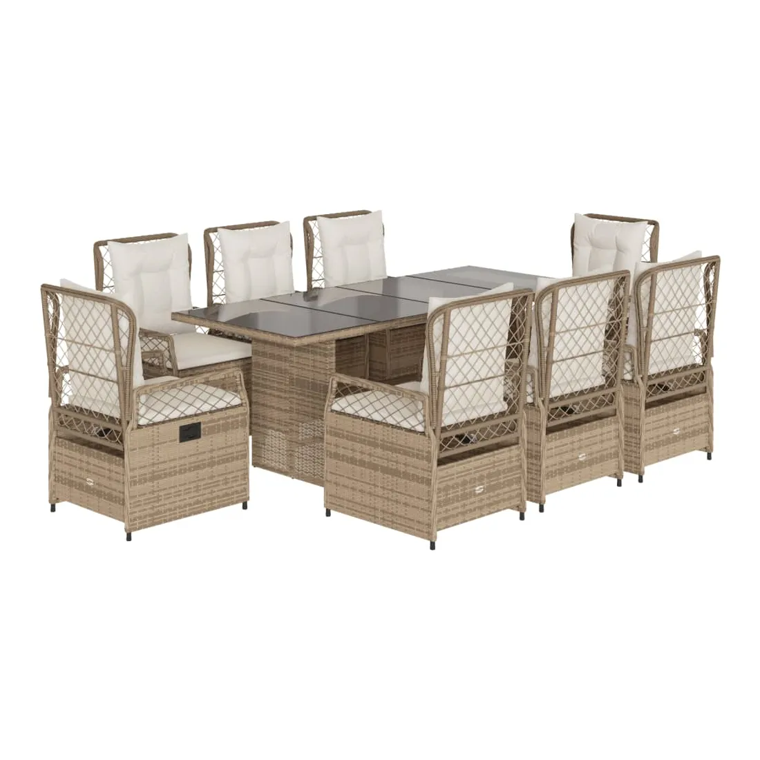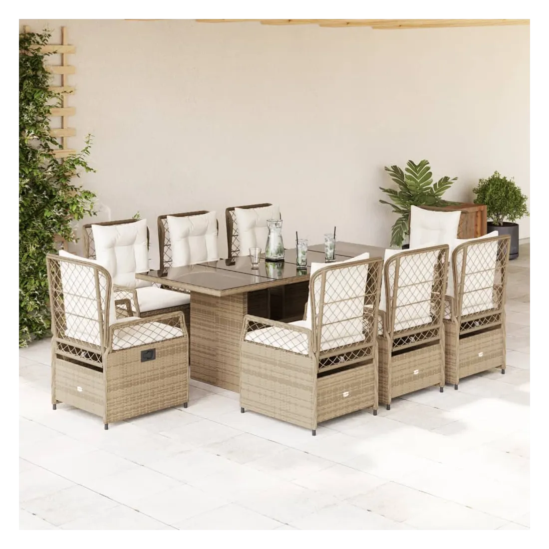 Cet ensemble de salle à manger de jardin est un excellent choix pour les repas en plein air ou pour vous détendre dans le jardin, dans l'arrière-cour ou sur la terrasse. Matériau durable : la résine tressée, également connue sous le nom de poly rotin, est un matériau synthétique solide et nécessitant peu d'entretien qui ressemble au rotin naturel. Il est léger, facile à nettoyer et couramment utilisé pour les meubles d'extérieur en raison de sa durabilité et de ses propriétés de résistance aux intempéries.Dossier réglable : ce siège de jardin est doté d'une poignée. Vous pouvez régler le dossier dans n'importe quelle position en tirant sur la poignée et le remettre rapidement dans sa position initiale.Expérience d'assise confortable : ce mobilier d'extérieur, doté de coussins épais, offre une expérience d'assise confortable.Housse amovible et lavable : le coussin de siège est doté d'une housse amovible pour un lavage et un entretien faciles.Dessus en verre : le dessus de la table d'extérieur est fabriqué en verre trempé solide et durable, ce qui le rend facile à nettoyer avec un chiffon humide et ajoute une touche d'élégance à votre espace extérieur. Bon à savoir :Pour que vos meubles d'extérieur restent beaux, nous vous recommandons de les protéger avec une housse imperméable.