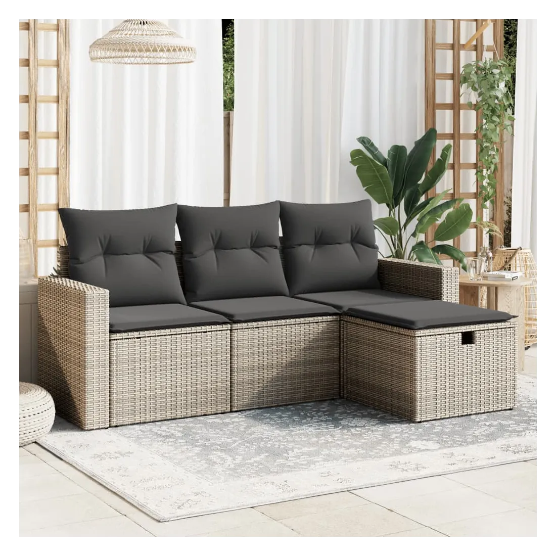 Cet ensemble de canapés de jardin est le complément parfait de votre arrière-cour, terrasse ou patio, offrant un espace confortable et accueillant pour discuter avec la famille et les amis ou simplement se détendre et profiter de l'extérieur. Matériau durable : la résine tressée, également connue sous le nom de poly rotin, est un matériau synthétique solide et nécessitant peu d'entretien qui ressemble au rotin naturel. Il est léger, facile à nettoyer et couramment utilisé pour les meubles d'extérieur en raison de sa durabilité et de ses propriétés de résistance aux intempéries.Expérience d'assise confortable : ce mobilier d'extérieur, doté de coussins épais, offre une expérience d'assise confortable.Housse amovible et lavable : ces coussins de siège sont dotés de housses amovibles pour un lavage et un entretien faciles.Cadre robuste et stable : le cadre en acier enduit de poudre assure la solidité et la stabilité du meuble de jardin pour une utilisation quotidienne à l'extérieur.Conception modulaire : cet ensemble de meubles d'extérieur a une conception modulaire, ce qui le rend complètement flexible et facile à déplacer, afin que vous puissiez créer un agencement de meubles d'extérieur personnalisé. Bon à savoir :Pour que vos meubles d'extérieur restent beaux, nous vous recommandons de les protéger avec une housse imperméable.