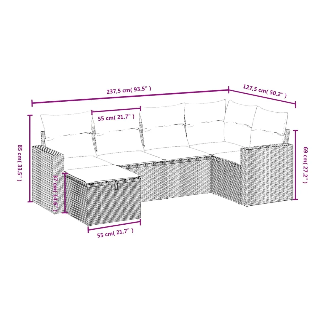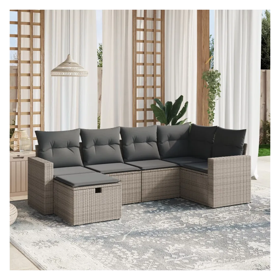 Cet ensemble de canapés de jardin est le complément parfait de votre arrière-cour, terrasse ou patio, offrant un espace confortable et accueillant pour discuter avec la famille et les amis ou simplement se détendre et profiter de l'extérieur. Matériau durable : la résine tressée, également connue sous le nom de poly rotin, est un matériau synthétique solide et nécessitant peu d'entretien qui ressemble au rotin naturel. Il est léger, facile à nettoyer et couramment utilisé pour les meubles d'extérieur en raison de sa durabilité et de ses propriétés de résistance aux intempéries.Expérience d'assise confortable : ce mobilier d'extérieur, doté de coussins épais, offre une expérience d'assise confortable.Housse amovible et lavable : ces coussins de siège sont dotés de housses amovibles pour un lavage et un entretien faciles.Cadre robuste et stable : le cadre en acier enduit de poudre assure la solidité et la stabilité du meuble de jardin pour une utilisation quotidienne à l'extérieur.Conception modulaire : cet ensemble de meubles d'extérieur a une conception modulaire, ce qui le rend complètement flexible et facile à déplacer, afin que vous puissiez créer un agencement de meubles d'extérieur personnalisé. Bon à savoir :Pour que vos meubles d'extérieur restent beaux, nous vous recommandons de les protéger avec une housse imperméable.