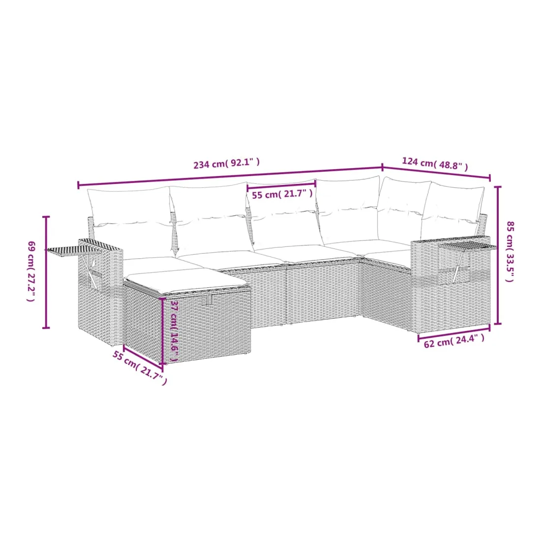 Cet ensemble de canapés de jardin est le complément parfait de votre arrière-cour, terrasse ou patio, offrant un espace confortable et accueillant pour discuter avec la famille et les amis ou simplement se détendre et profiter de l'extérieur. Matériau durable : la résine tressée, également connue sous le nom de poly rotin, est un matériau synthétique solide et nécessitant peu d'entretien qui ressemble au rotin naturel. Il est léger, facile à nettoyer et couramment utilisé pour les meubles d'extérieur en raison de sa durabilité et de ses propriétés de résistance aux intempéries.Expérience d'assise confortable : ce mobilier d'extérieur, doté de coussins épais, offre une expérience d'assise confortable.Housse amovible et lavable : ces coussins de siège sont dotés de housses amovibles pour un lavage et un entretien faciles.Cadre robuste et stable : le cadre en acier enduit de poudre assure la solidité et la stabilité du meuble de jardin pour une utilisation quotidienne à l'extérieur.Conception modulaire : cet ensemble de meubles d'extérieur a une conception modulaire, ce qui le rend complètement flexible et facile à déplacer, afin que vous puissiez créer un agencement de meubles d'extérieur personnalisé. Bon à savoir :Pour que vos meubles d'extérieur restent beaux, nous vous recommandons de les protéger avec une housse imperméable.