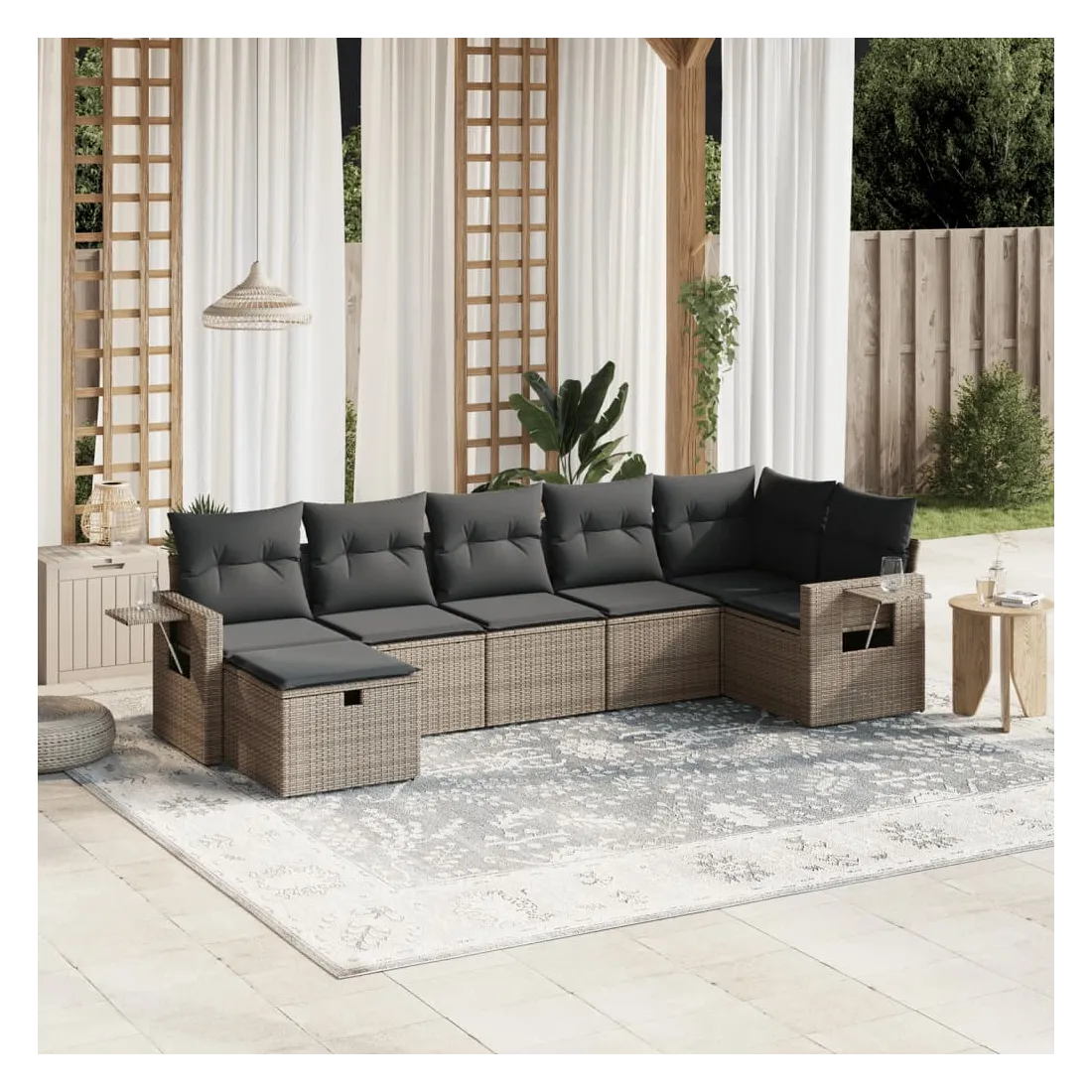 Cet ensemble de canapés de jardin est le complément parfait de votre arrière-cour, terrasse ou patio, offrant un espace confortable et accueillant pour discuter avec la famille et les amis ou simplement se détendre et profiter de l'extérieur. Matériau durable : la résine tressée, également connue sous le nom de poly rotin, est un matériau synthétique solide et nécessitant peu d'entretien qui ressemble au rotin naturel. Il est léger, facile à nettoyer et couramment utilisé pour les meubles d'extérieur en raison de sa durabilité et de ses propriétés de résistance aux intempéries.Expérience d'assise confortable : ce mobilier d'extérieur, doté de coussins épais, offre une expérience d'assise confortable.Housse amovible et lavable : ces coussins de siège sont dotés de housses amovibles pour un lavage et un entretien faciles.Cadre robuste et stable : le cadre en acier enduit de poudre assure la solidité et la stabilité du meuble de jardin pour une utilisation quotidienne à l'extérieur.Conception modulaire : cet ensemble de meubles d'extérieur a une conception modulaire, ce qui le rend complètement flexible et facile à déplacer, afin que vous puissiez créer un agencement de meubles d'extérieur personnalisé. Bon à savoir :Pour que vos meubles d'extérieur restent beaux, nous vous recommandons de les protéger avec une housse imperméable.