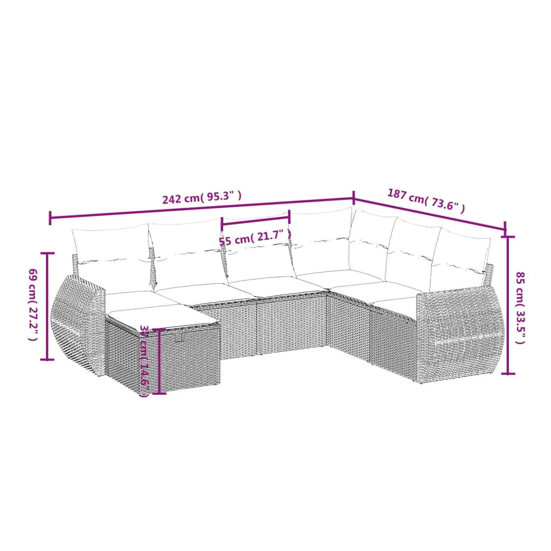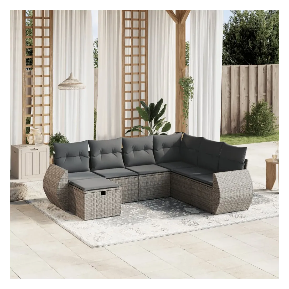 Cet ensemble de canapés de jardin est le complément parfait de votre arrière-cour, terrasse ou patio, offrant un espace confortable et accueillant pour discuter avec la famille et les amis ou simplement se détendre et profiter de l'extérieur. Matériau durable : la résine tressée, également connue sous le nom de poly rotin, est un matériau synthétique solide et nécessitant peu d'entretien qui ressemble au rotin naturel. Il est léger, facile à nettoyer et couramment utilisé pour les meubles d'extérieur en raison de sa durabilité et de ses propriétés de résistance aux intempéries.Expérience d'assise confortable : ce mobilier d'extérieur, doté de coussins épais, offre une expérience d'assise confortable.Housse amovible et lavable : ces coussins de siège sont dotés de housses amovibles pour un lavage et un entretien faciles.Cadre robuste et stable : le cadre en acier enduit de poudre assure la solidité et la stabilité du meuble de jardin pour une utilisation quotidienne à l'extérieur.Conception modulaire : cet ensemble de meubles d'extérieur a une conception modulaire, ce qui le rend complètement flexible et facile à déplacer, afin que vous puissiez créer un agencement de meubles d'extérieur personnalisé. Bon à savoir :Pour que vos meubles d'extérieur restent beaux, nous vous recommandons de les protéger avec une housse imperméable.