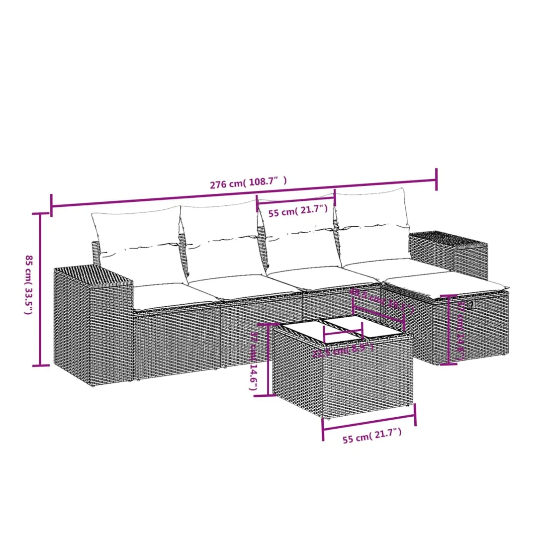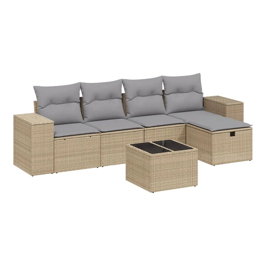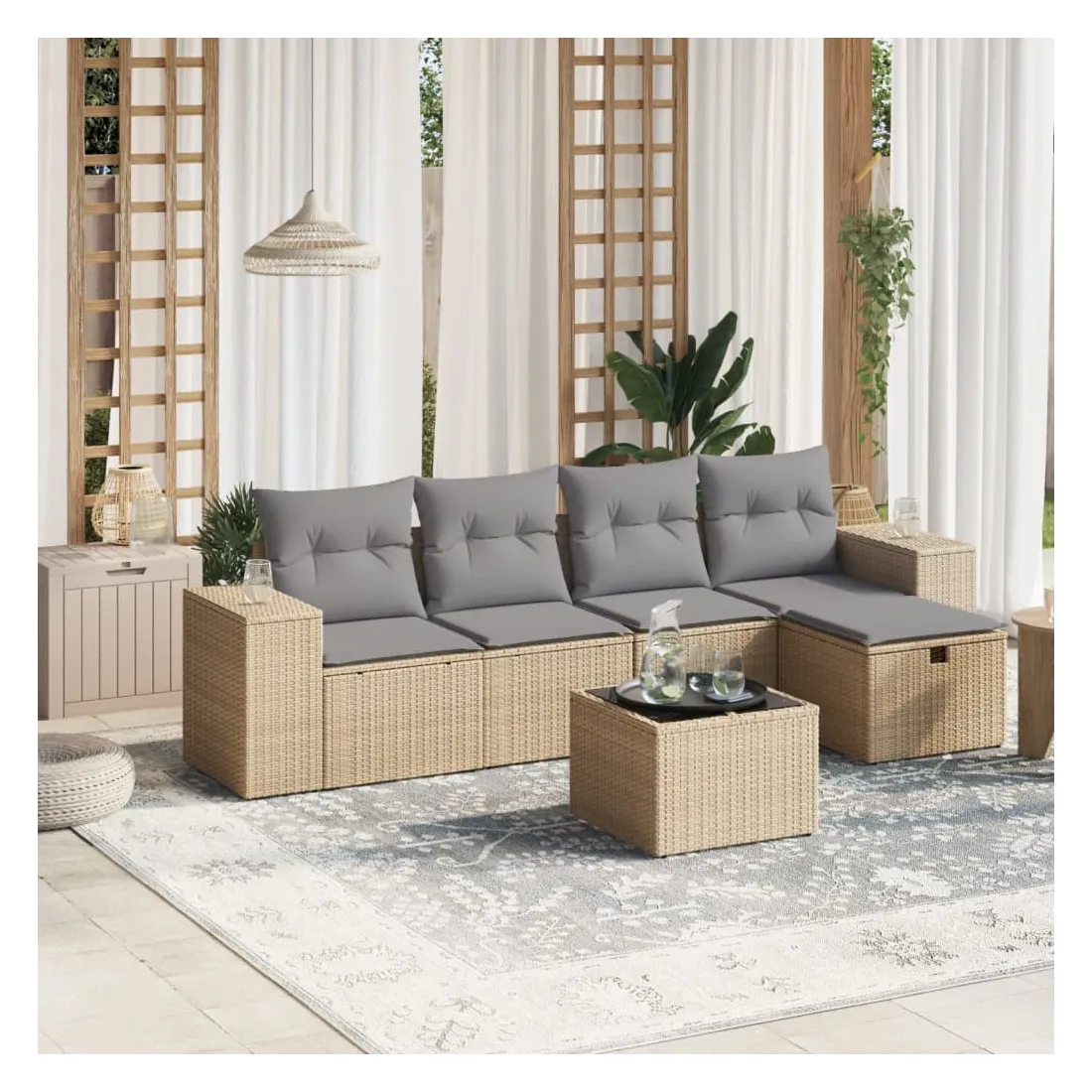 Cet ensemble de canapés de jardin est le complément parfait de votre arrière-cour, terrasse ou patio, offrant un espace confortable et accueillant pour discuter avec la famille et les amis ou simplement se détendre et profiter de l'extérieur. Matériau durable : la résine tressée, également connue sous le nom de poly rotin, est un matériau synthétique solide et nécessitant peu d'entretien qui ressemble au rotin naturel. Il est léger, facile à nettoyer et couramment utilisé pour les meubles d'extérieur en raison de sa durabilité et de ses propriétés de résistance aux intempéries.Dessus en verre : le dessus de la table d'extérieur est fabriqué en verre trempé solide et durable, ce qui le rend facile à nettoyer avec un chiffon humide et ajoute une touche d'élégance à votre espace extérieur.Housse amovible et lavable : ces coussins de siège sont dotés de housses amovibles pour un lavage et un entretien faciles.Cadre robuste et stable : le cadre en acier enduit de poudre assure la solidité et la stabilité du meuble de jardin pour une utilisation quotidienne à l'extérieur.Conception modulaire : cet ensemble de meubles d'extérieur a une conception modulaire, ce qui le rend complètement flexible et facile à déplacer, afin que vous puissiez créer un agencement de meubles d'extérieur personnalisé. Bon à savoir :Pour que vos meubles d'extérieur restent beaux, nous vous recommandons de les protéger avec une housse imperméable.