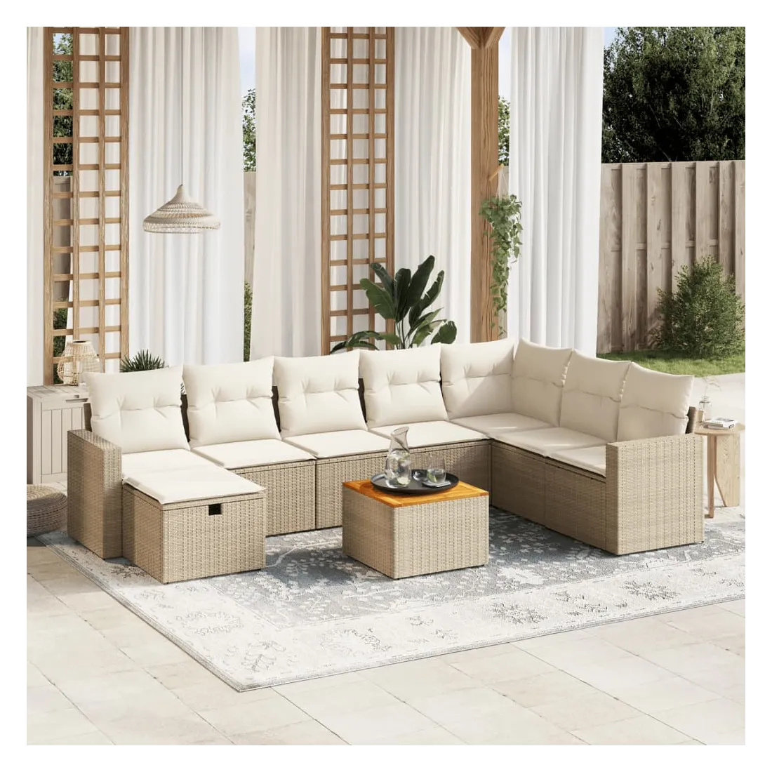 Cet ensemble de canapés de jardin est le complément parfait de votre arrière-cour, terrasse ou patio, offrant un espace confortable et accueillant pour discuter avec la famille et les amis ou simplement se détendre et profiter de l'extérieur. Matériau durable : la résine tressée, également connue sous le nom de poly rotin, est un matériau synthétique solide et nécessitant peu d'entretien qui ressemble au rotin naturel. Il est léger, facile à nettoyer et couramment utilisé pour les meubles d'extérieur en raison de sa durabilité et de ses propriétés de résistance aux intempéries.Dessus stable et facile à nettoyer : cette table de jardin a un dessus en bois d'acacia robuste, durable et facile à nettoyer avec un chiffon humide.Housse amovible et lavable : ces coussins de siège sont dotés de housses amovibles pour un lavage et un entretien faciles.Cadre robuste et stable : le cadre en acier enduit de poudre assure la solidité et la stabilité du meuble de jardin pour une utilisation quotidienne à l'extérieur.Conception modulaire : cet ensemble de meubles d'extérieur a une conception modulaire, ce qui le rend complètement flexible et facile à déplacer, afin que vous puissiez créer un agencement de meubles d'extérieur personnalisé. Bon à savoir :Pour que vos meubles d'extérieur restent beaux, nous vous recommandons de les protéger avec une housse imperméable.