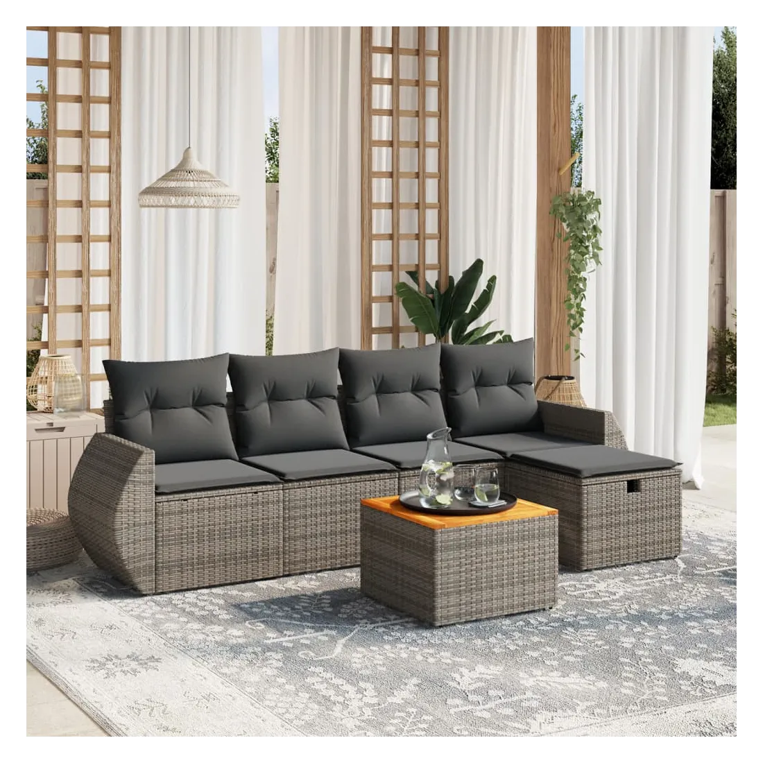 Cet ensemble de canapés de jardin est le complément parfait de votre arrière-cour, terrasse ou patio, offrant un espace confortable et accueillant pour discuter avec la famille et les amis ou simplement se détendre et profiter de l'extérieur. Matériau durable : la résine tressée, également connue sous le nom de poly rotin, est un matériau synthétique solide et nécessitant peu d'entretien qui ressemble au rotin naturel. Il est léger, facile à nettoyer et couramment utilisé pour les meubles d'extérieur en raison de sa durabilité et de ses propriétés de résistance aux intempéries.Dessus stable et facile à nettoyer : cette table de jardin a un dessus en bois d'acacia robuste, durable et facile à nettoyer avec un chiffon humide.Housse amovible et lavable : ces coussins de siège sont dotés de housses amovibles pour un lavage et un entretien faciles.Cadre robuste et stable : le cadre en acier enduit de poudre assure la solidité et la stabilité du meuble de jardin pour une utilisation quotidienne à l'extérieur.Conception modulaire : cet ensemble de meubles d'extérieur a une conception modulaire, ce qui le rend complètement flexible et facile à déplacer, afin que vous puissiez créer un agencement de meubles d'extérieur personnalisé. Bon à savoir :Pour que vos meubles d'extérieur restent beaux, nous vous recommandons de les protéger avec une housse imperméable.