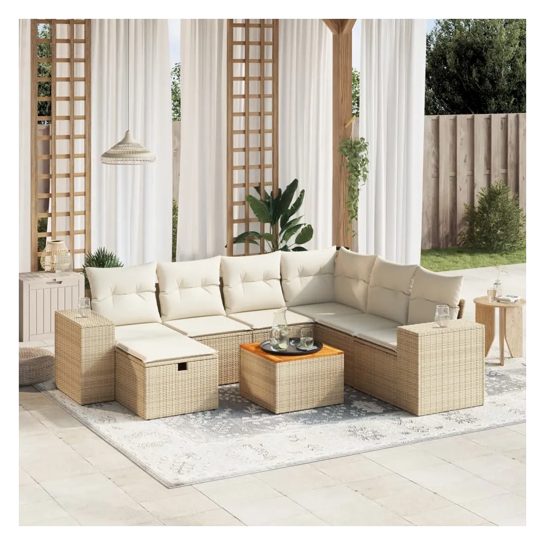 Cet ensemble de canapés de jardin est le complément parfait de votre arrière-cour, terrasse ou patio, offrant un espace confortable et accueillant pour discuter avec la famille et les amis ou simplement se détendre et profiter de l'extérieur. Matériau durable : la résine tressée, également connue sous le nom de poly rotin, est un matériau synthétique solide et nécessitant peu d'entretien qui ressemble au rotin naturel. Il est léger, facile à nettoyer et couramment utilisé pour les meubles d'extérieur en raison de sa durabilité et de ses propriétés de résistance aux intempéries.Dessus stable et facile à nettoyer : cette table de jardin a un dessus en bois d'acacia robuste, durable et facile à nettoyer avec un chiffon humide.Housse amovible et lavable : ces coussins de siège sont dotés de housses amovibles pour un lavage et un entretien faciles.Cadre robuste et stable : le cadre en acier enduit de poudre assure la solidité et la stabilité du meuble de jardin pour une utilisation quotidienne à l'extérieur.Conception modulaire : cet ensemble de meubles d'extérieur a une conception modulaire, ce qui le rend complètement flexible et facile à déplacer, afin que vous puissiez créer un agencement de meubles d'extérieur personnalisé. Bon à savoir :Pour que vos meubles d'extérieur restent beaux, nous vous recommandons de les protéger avec une housse imperméable.