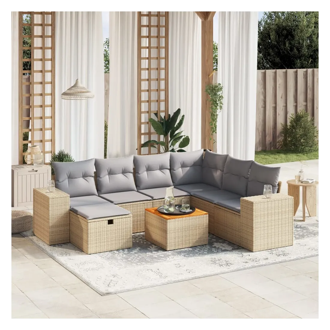 Cet ensemble de canapés de jardin est le complément parfait de votre arrière-cour, terrasse ou patio, offrant un espace confortable et accueillant pour discuter avec la famille et les amis ou simplement se détendre et profiter de l'extérieur. Matériau durable : la résine tressée, également connue sous le nom de poly rotin, est un matériau synthétique solide et nécessitant peu d'entretien qui ressemble au rotin naturel. Il est léger, facile à nettoyer et couramment utilisé pour les meubles d'extérieur en raison de sa durabilité et de ses propriétés de résistance aux intempéries.Dessus stable et facile à nettoyer : cette table de jardin a un dessus en bois d'acacia robuste, durable et facile à nettoyer avec un chiffon humide.Housse amovible et lavable : ces coussins de siège sont dotés de housses amovibles pour un lavage et un entretien faciles.Cadre robuste et stable : le cadre en acier enduit de poudre assure la solidité et la stabilité du meuble de jardin pour une utilisation quotidienne à l'extérieur.Conception modulaire : cet ensemble de meubles d'extérieur a une conception modulaire, ce qui le rend complètement flexible et facile à déplacer, afin que vous puissiez créer un agencement de meubles d'extérieur personnalisé. Bon à savoir :Pour que vos meubles d'extérieur restent beaux, nous vous recommandons de les protéger avec une housse imperméable.