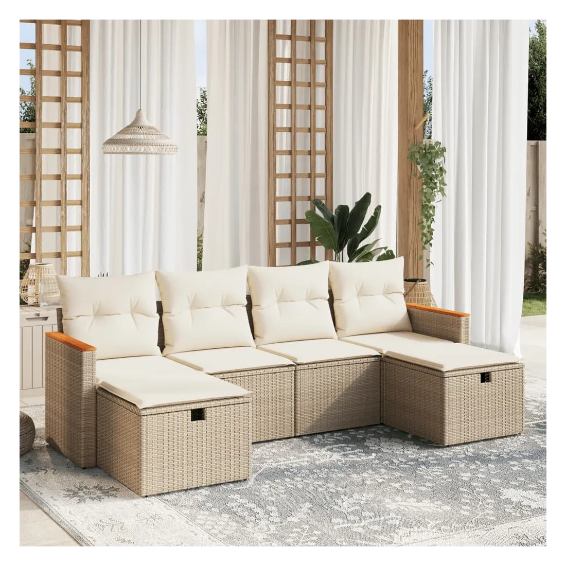 Cet ensemble de canapés de jardin est le complément parfait de votre arrière-cour, terrasse ou patio, offrant un espace confortable et accueillant pour discuter avec la famille et les amis ou simplement se détendre et profiter de l'extérieur. Matériau durable : la résine tressée, également connue sous le nom de poly rotin, est un matériau synthétique solide et nécessitant peu d'entretien qui ressemble au rotin naturel. Il est léger, facile à nettoyer et couramment utilisé pour les meubles d'extérieur en raison de sa durabilité et de ses propriétés de résistance aux intempéries.Expérience d'assise confortable : ce mobilier d'extérieur, doté de coussins épais, offre une expérience d'assise confortable.Housse amovible et lavable : ces coussins de siège sont dotés de housses amovibles pour un lavage et un entretien faciles.Cadre robuste et stable : le cadre en acier enduit de poudre assure la solidité et la stabilité du meuble de jardin pour une utilisation quotidienne à l'extérieur.Conception modulaire : cet ensemble de meubles d'extérieur a une conception modulaire, ce qui le rend complètement flexible et facile à déplacer, afin que vous puissiez créer un agencement de meubles d'extérieur personnalisé. Bon à savoir :Pour que vos meubles d'extérieur restent beaux, nous vous recommandons de les protéger avec une housse imperméable.