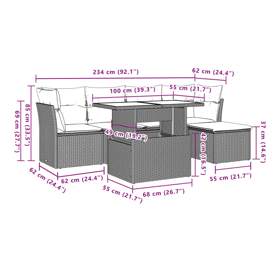 Cet ensemble de canapés de jardin est le complément parfait de votre arrière-cour, terrasse ou patio, offrant un espace confortable et accueillant pour discuter avec la famille et les amis ou simplement se détendre et profiter de l'extérieur. Matériau durable : la résine tressée, également connue sous le nom de poly rotin, est un matériau synthétique solide et nécessitant peu d'entretien qui ressemble au rotin naturel. Il est léger, facile à nettoyer et couramment utilisé pour les meubles d'extérieur en raison de sa durabilité et de ses propriétés de résistance aux intempéries.Dessus de table réglable : le dessus de table peut être soulevé pour rendre la table plus haute, ce qui transforme la table d'extérieur d'une table basse à une table de salle à manger. Elle est parfaite pour recevoir des invités ou prendre des repas à l'extérieur.Expérience d'assise confortable : ce mobilier d'extérieur, doté de coussins épais, offre une expérience d'assise confortable.Housse amovible et lavable : ces coussins de siège sont dotés de housses amovibles pour un lavage et un entretien faciles.Conception modulaire : cet ensemble de meubles d'extérieur a une conception modulaire, ce qui le rend complètement flexible et facile à déplacer, afin que vous puissiez créer un agencement de meubles d'extérieur personnalisé. Bon à savoir :Pour que vos meubles d'extérieur restent beaux, nous vous recommandons de les protéger avec une housse imperméable.