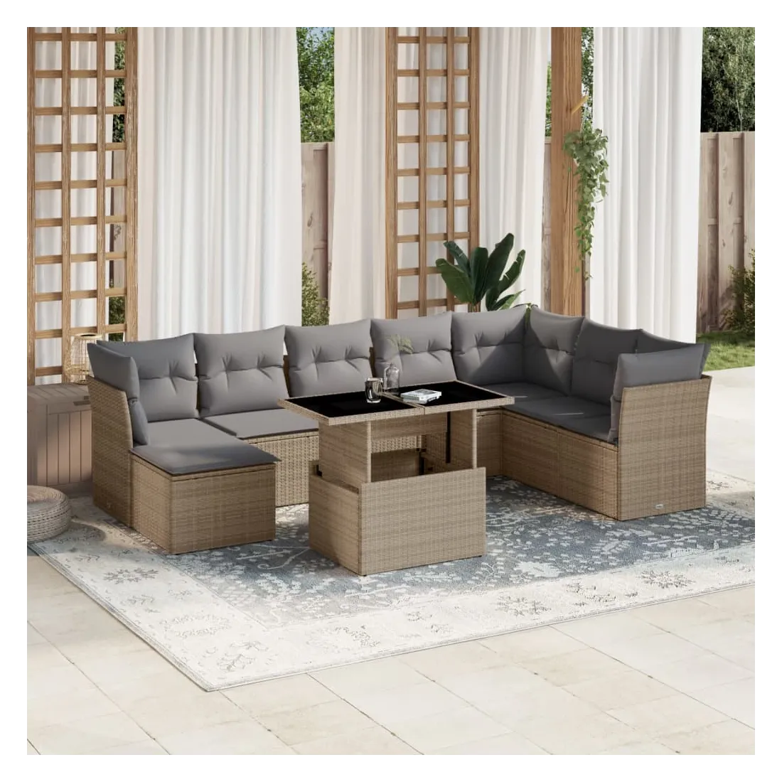Cet ensemble de canapés de jardin est le complément parfait de votre arrière-cour, terrasse ou patio, offrant un espace confortable et accueillant pour discuter avec la famille et les amis ou simplement se détendre et profiter de l'extérieur. Matériau durable : la résine tressée, également connue sous le nom de poly rotin, est un matériau synthétique solide et nécessitant peu d'entretien qui ressemble au rotin naturel. Il est léger, facile à nettoyer et couramment utilisé pour les meubles d'extérieur en raison de sa durabilité et de ses propriétés de résistance aux intempéries.Dessus de table réglable : le dessus de table peut être soulevé pour rendre la table plus haute, ce qui transforme la table d'extérieur d'une table basse à une table de salle à manger. Elle est parfaite pour recevoir des invités ou prendre des repas à l'extérieur.Expérience d'assise confortable : ce mobilier d'extérieur, doté de coussins épais, offre une expérience d'assise confortable.Housse amovible et lavable : ces coussins de siège sont dotés de housses amovibles pour un lavage et un entretien faciles.Conception modulaire : cet ensemble de meubles d'extérieur a une conception modulaire, ce qui le rend complètement flexible et facile à déplacer, afin que vous puissiez créer un agencement de meubles d'extérieur personnalisé. Bon à savoir :Pour que vos meubles d'extérieur restent beaux, nous vous recommandons de les protéger avec une housse imperméable.
