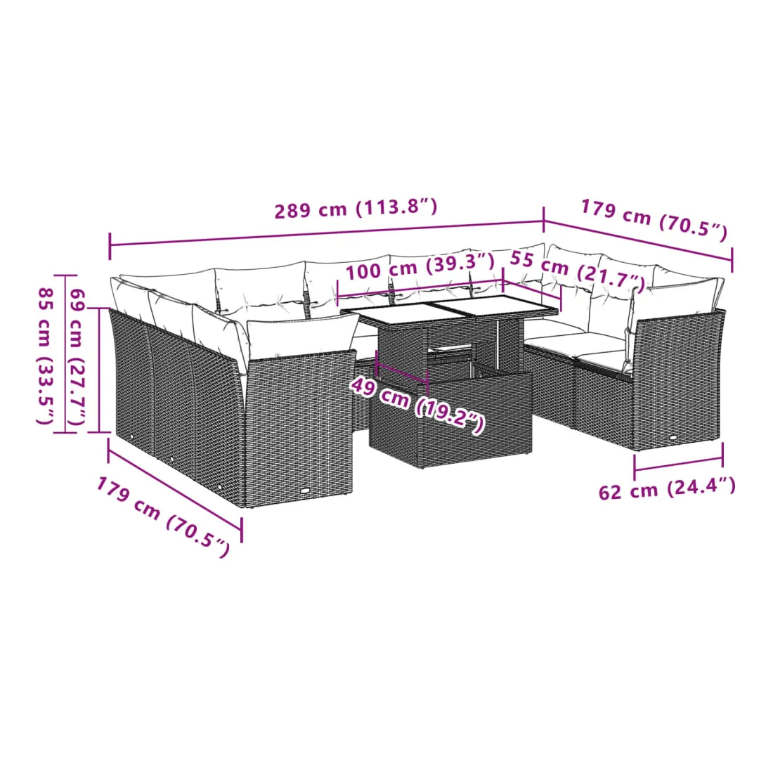 Cet ensemble de canapés de jardin est le complément parfait de votre arrière-cour, terrasse ou patio, offrant un espace confortable et accueillant pour discuter avec la famille et les amis ou simplement se détendre et profiter de l'extérieur. Matériau durable : la résine tressée, également connue sous le nom de poly rotin, est un matériau synthétique solide et nécessitant peu d'entretien qui ressemble au rotin naturel. Il est léger, facile à nettoyer et couramment utilisé pour les meubles d'extérieur en raison de sa durabilité et de ses propriétés de résistance aux intempéries.Dessus de table réglable : le dessus de table peut être soulevé pour rendre la table plus haute, ce qui transforme la table d'extérieur d'une table basse à une table de salle à manger. Elle est parfaite pour recevoir des invités ou prendre des repas à l'extérieur.Expérience d'assise confortable : ce mobilier d'extérieur, doté de coussins épais, offre une expérience d'assise confortable.Housse amovible et lavable : ces coussins de siège sont dotés de housses amovibles pour un lavage et un entretien faciles.Conception modulaire : cet ensemble de meubles d'extérieur a une conception modulaire, ce qui le rend complètement flexible et facile à déplacer, afin que vous puissiez créer un agencement de meubles d'extérieur personnalisé. Bon à savoir :Pour que vos meubles d'extérieur restent beaux, nous vous recommandons de les protéger avec une housse imperméable.