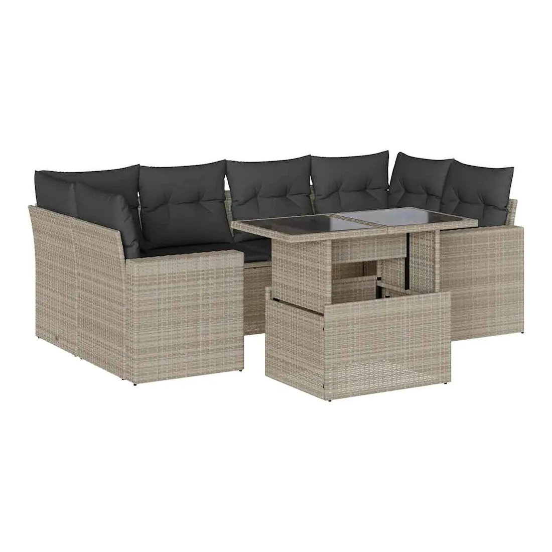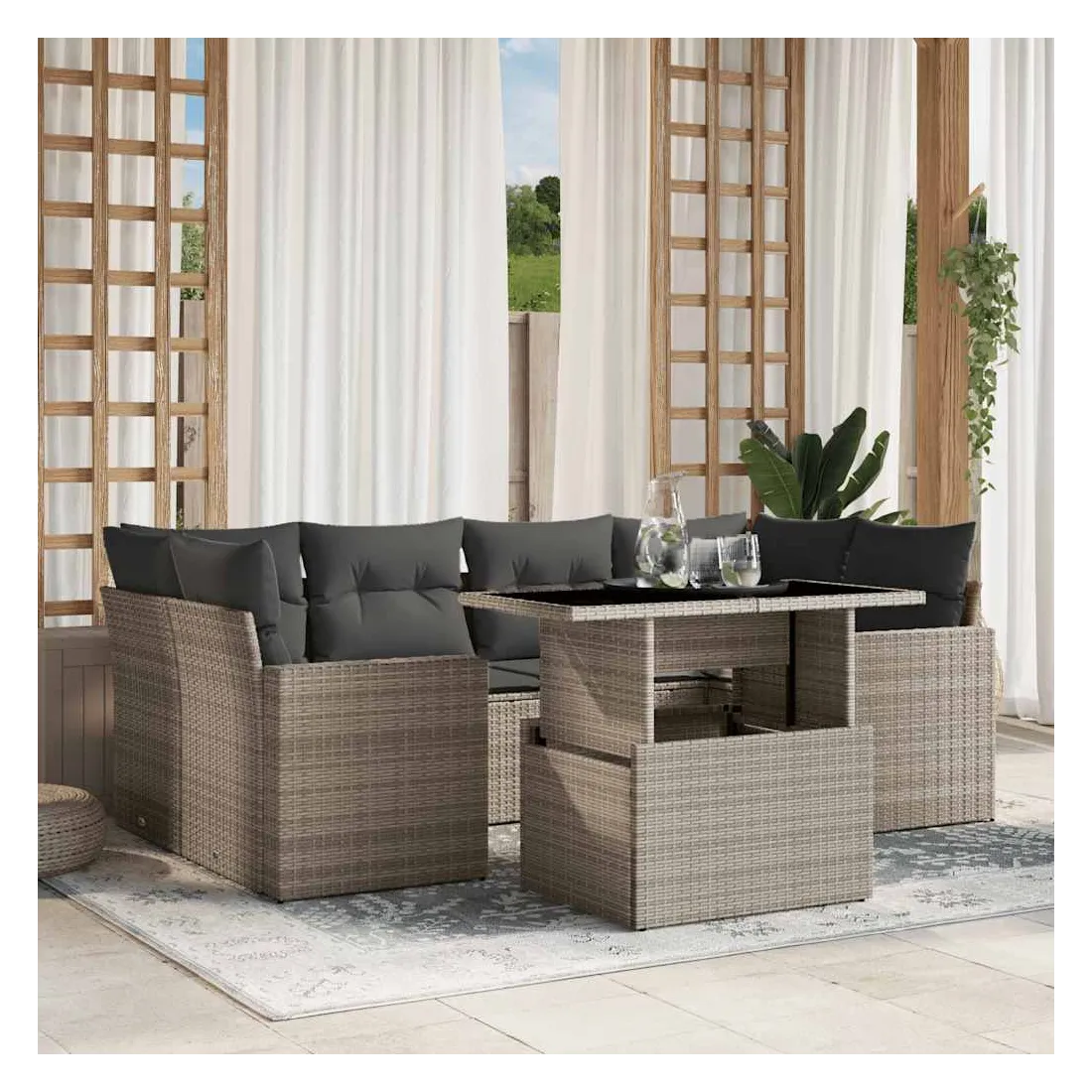 Cet ensemble de canapés de jardin est le complément parfait de votre arrière-cour, terrasse ou patio, offrant un espace confortable et accueillant pour discuter avec la famille et les amis ou simplement se détendre et profiter de l'extérieur. Matériau durable : la résine tressée, également connue sous le nom de poly rotin, est un matériau synthétique solide et nécessitant peu d'entretien qui ressemble au rotin naturel. Elle est légère, facile à nettoyer et couramment utilisée pour les meubles d'extérieur en raison de sa durabilité et de ses propriétés de résistance aux intempéries.Dessus de table réglable : le dessus de table peut être soulevé pour rendre la table plus haute, ce qui transforme la table d'extérieur d'une table basse à une table de salle à manger. Elle est parfaite pour recevoir des invités ou prendre des repas à l'extérieur.Expérience d'assise confortable : ce mobilier d'extérieur, doté de coussins épais, offre une expérience d'assise confortable.Housse amovible et lavable : ces coussins de siège sont dotés de housses amovibles pour un lavage et un entretien faciles.Conception modulaire : cet ensemble de meubles d'extérieur a une conception modulaire, ce qui le rend complètement flexible et facile à déplacer, afin que vous puissiez créer un agencement de meubles d'extérieur personnalisé. Bon à savoir :Pour que vos meubles d'extérieur restent beaux, nous vous recommandons de les protéger avec une housse imperméable.