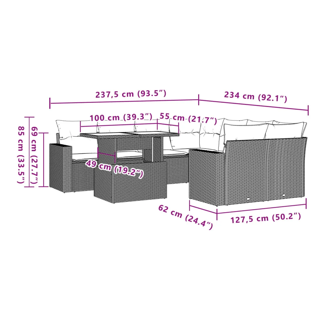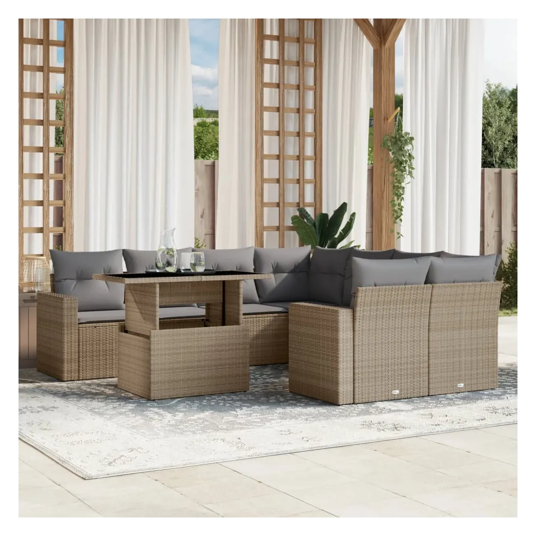 Cet ensemble de canapés de jardin est le complément parfait de votre arrière-cour, terrasse ou patio, offrant un espace confortable et accueillant pour discuter avec la famille et les amis ou simplement se détendre et profiter de l'extérieur. Matériau durable : la résine tressée, également connue sous le nom de poly rotin, est un matériau synthétique solide et nécessitant peu d'entretien qui ressemble au rotin naturel. Il est léger, facile à nettoyer et couramment utilisé pour les meubles d'extérieur en raison de sa durabilité et de ses propriétés de résistance aux intempéries.Dessus de table réglable : le dessus de table peut être soulevé pour rendre la table plus haute, ce qui transforme la table d'extérieur d'une table basse à une table de salle à manger. Elle est parfaite pour recevoir des invités ou prendre des repas à l'extérieur.Expérience d'assise confortable : ce mobilier d'extérieur, doté de coussins épais, offre une expérience d'assise confortable.Housse amovible et lavable : ces coussins de siège sont dotés de housses amovibles pour un lavage et un entretien faciles.Conception modulaire : cet ensemble de meubles d'extérieur a une conception modulaire, ce qui le rend complètement flexible et facile à déplacer, afin que vous puissiez créer un agencement de meubles d'extérieur personnalisé. Bon à savoir :Pour que vos meubles d'extérieur restent beaux, nous vous recommandons de les protéger avec une housse imperméable.