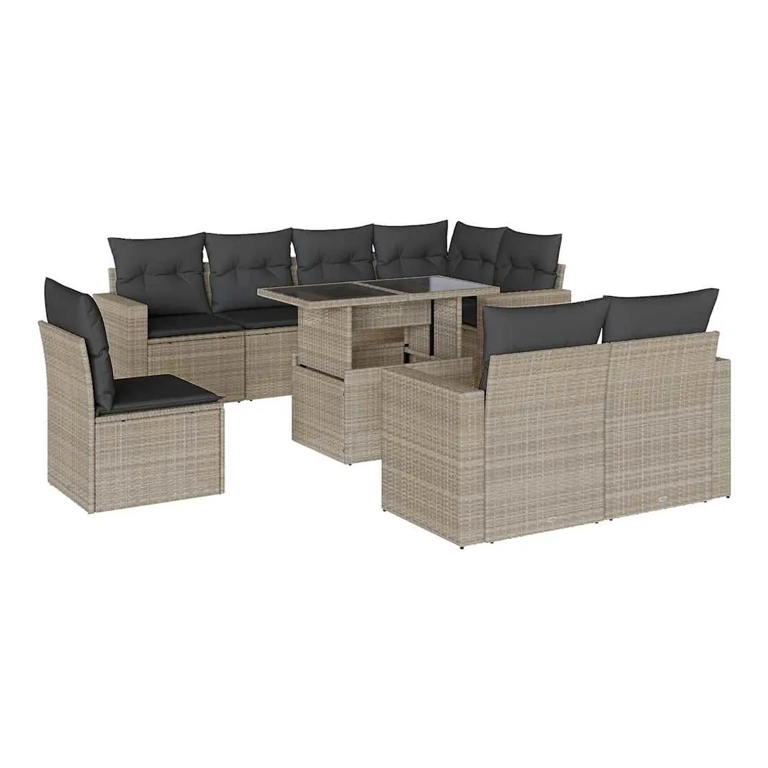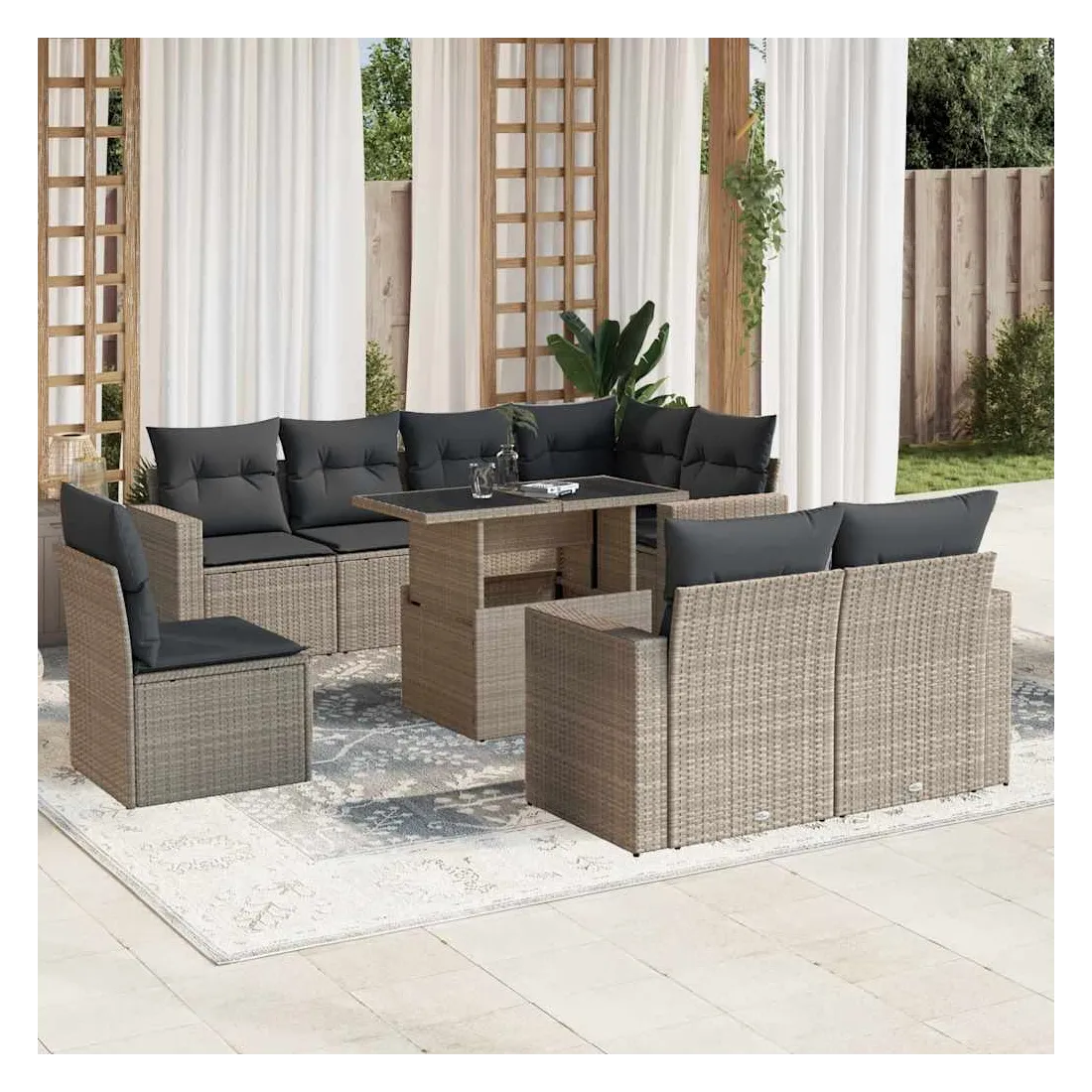 Cet ensemble de canapés de jardin est le complément parfait de votre arrière-cour, terrasse ou patio, offrant un espace confortable et accueillant pour discuter avec la famille et les amis ou simplement se détendre et profiter de l'extérieur. Matériau durable : la résine tressée, également connue sous le nom de poly rotin, est un matériau synthétique solide et nécessitant peu d'entretien qui ressemble au rotin naturel. Elle est légère, facile à nettoyer et couramment utilisée pour les meubles d'extérieur en raison de sa durabilité et de ses propriétés de résistance aux intempéries.Dessus de table réglable : le dessus de table peut être soulevé pour rendre la table plus haute, ce qui transforme la table d'extérieur d'une table basse à une table de salle à manger. Elle est parfaite pour recevoir des invités ou prendre des repas à l'extérieur.Expérience d'assise confortable : ce mobilier d'extérieur, doté de coussins épais, offre une expérience d'assise confortable.Housse amovible et lavable : ces coussins de siège sont dotés de housses amovibles pour un lavage et un entretien faciles.Conception modulaire : cet ensemble de meubles d'extérieur a une conception modulaire, ce qui le rend complètement flexible et facile à déplacer, afin que vous puissiez créer un agencement de meubles d'extérieur personnalisé. Bon à savoir :Pour que vos meubles d'extérieur restent beaux, nous vous recommandons de les protéger avec une housse imperméable.
