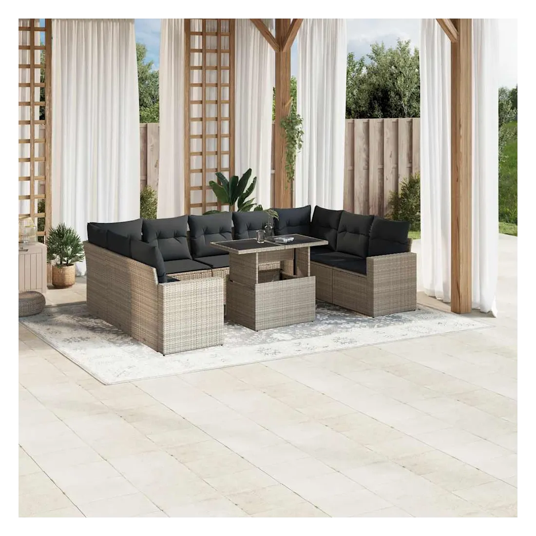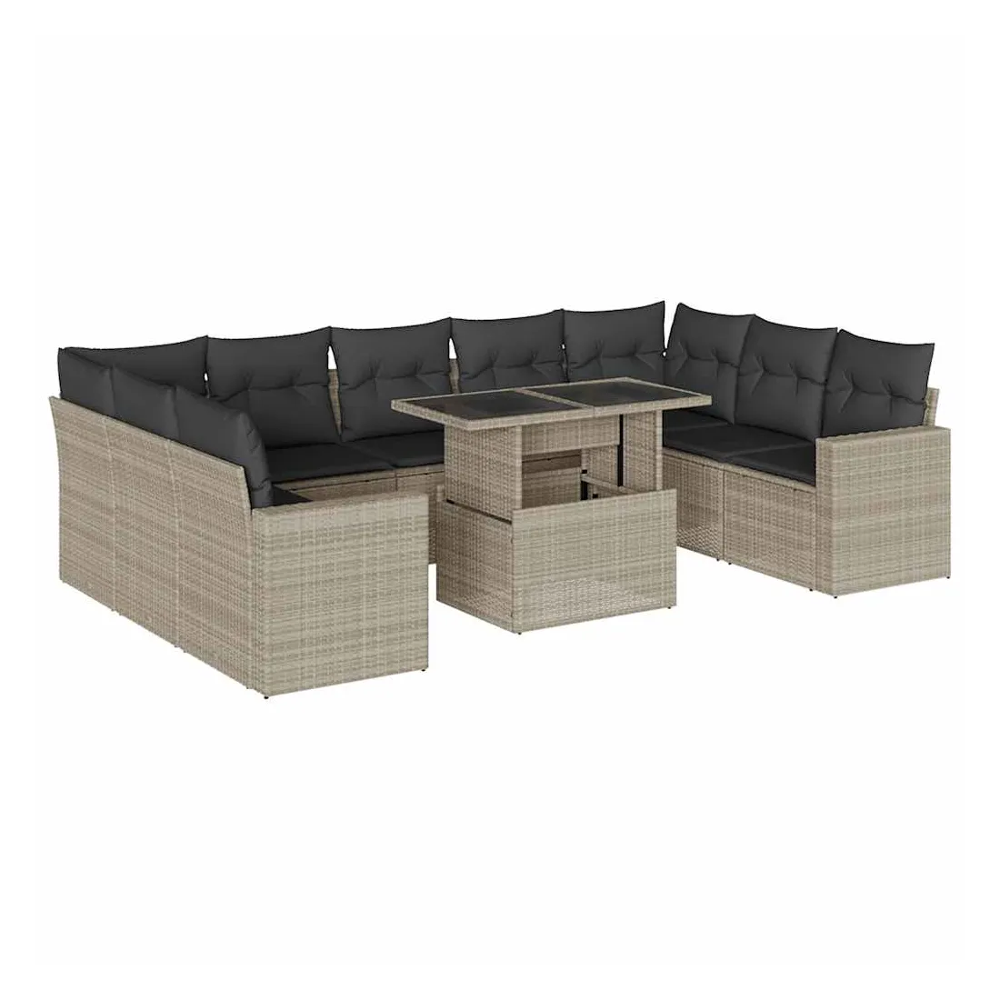 Cet ensemble de canapés de jardin est le complément parfait de votre arrière-cour, terrasse ou patio, offrant un espace confortable et accueillant pour discuter avec la famille et les amis ou simplement se détendre et profiter de l'extérieur. Matériau durable : la résine tressée, également connue sous le nom de poly rotin, est un matériau synthétique solide et nécessitant peu d'entretien qui ressemble au rotin naturel. Elle est légère, facile à nettoyer et couramment utilisée pour les meubles d'extérieur en raison de sa durabilité et de ses propriétés de résistance aux intempéries.Dessus de table réglable : le dessus de table peut être soulevé pour rendre la table plus haute, ce qui transforme la table d'extérieur d'une table basse à une table de salle à manger. Elle est parfaite pour recevoir des invités ou prendre des repas à l'extérieur.Expérience d'assise confortable : ce mobilier d'extérieur, doté de coussins épais, offre une expérience d'assise confortable.Housse amovible et lavable : ces coussins de siège sont dotés de housses amovibles pour un lavage et un entretien faciles.Conception modulaire : cet ensemble de meubles d'extérieur a une conception modulaire, ce qui le rend complètement flexible et facile à déplacer, afin que vous puissiez créer un agencement de meubles d'extérieur personnalisé. Bon à savoir :Pour que vos meubles d'extérieur restent beaux, nous vous recommandons de les protéger avec une housse imperméable.
