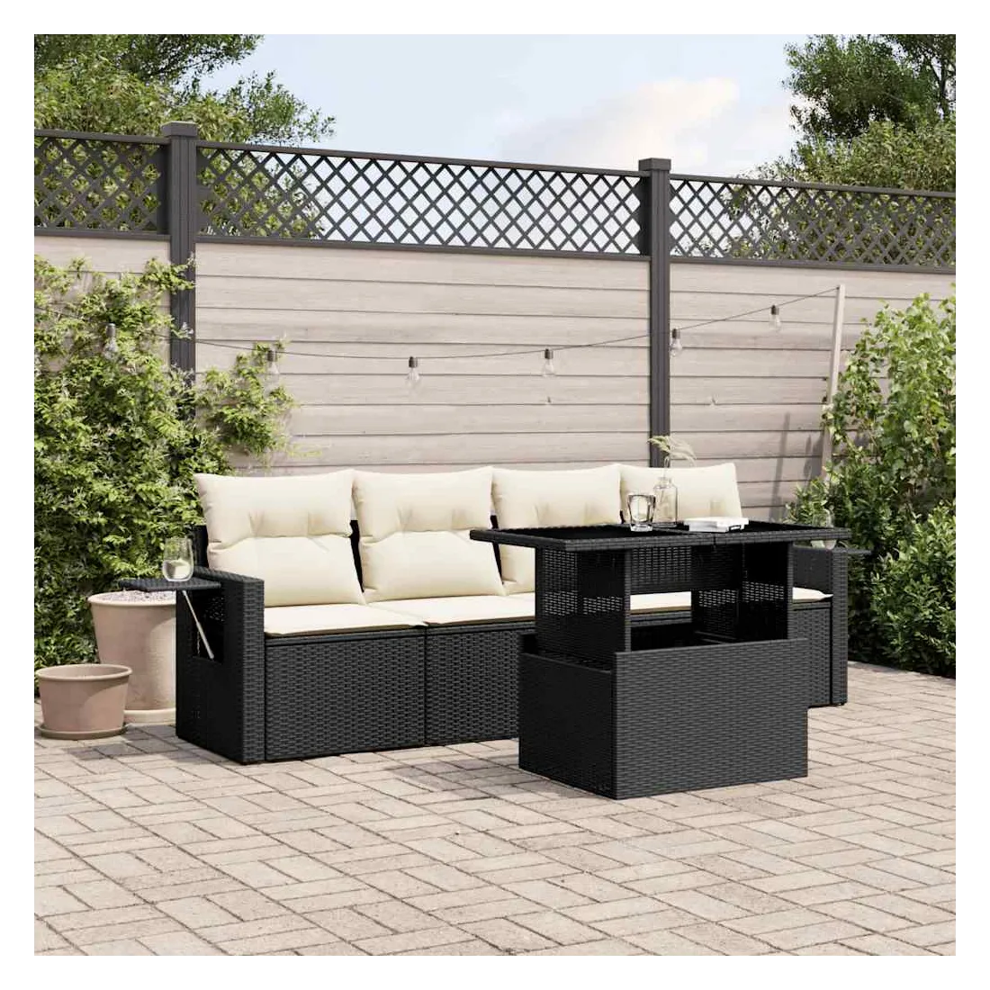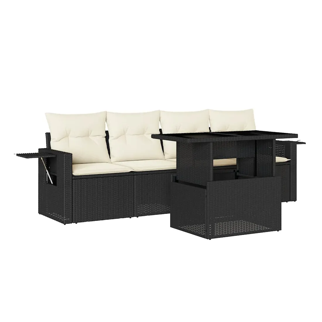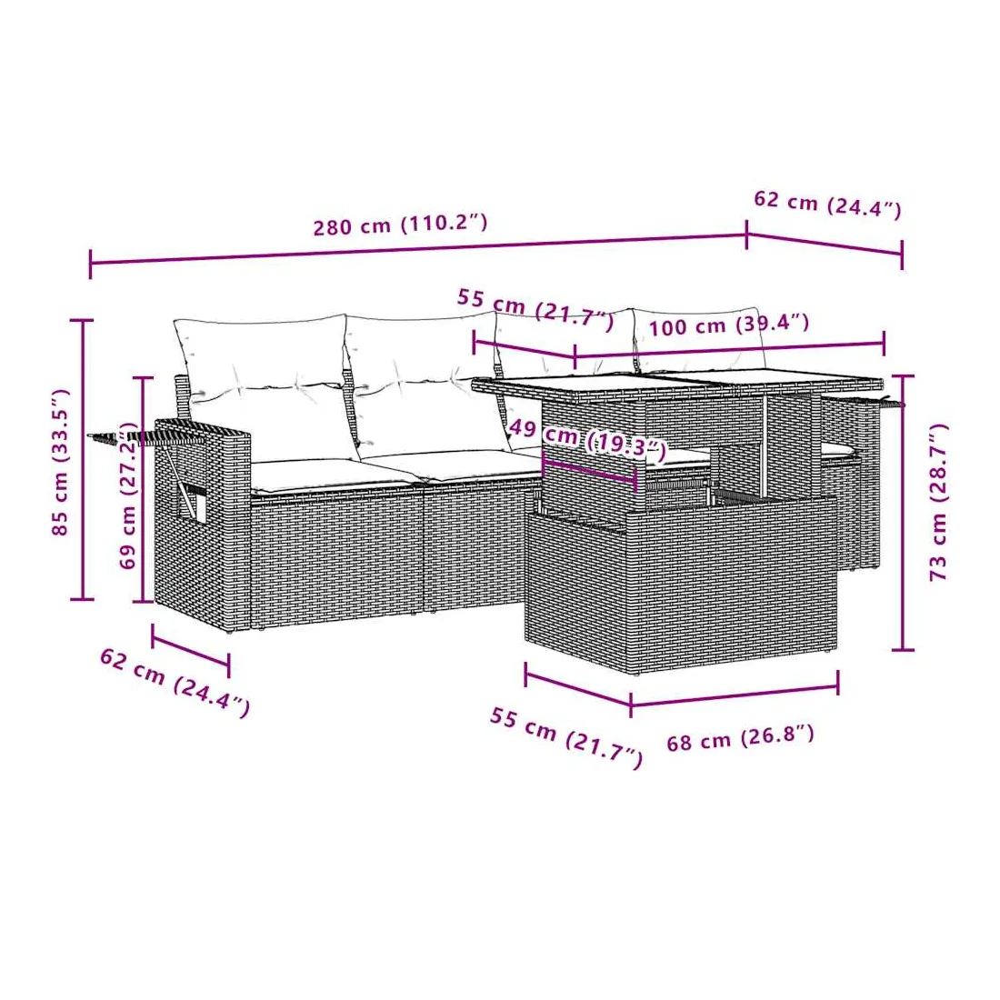 Cet ensemble de canapés de jardin est le complément parfait de votre arrière-cour, terrasse ou patio, offrant un espace confortable et accueillant pour discuter avec la famille et les amis ou simplement se détendre et profiter de l'extérieur. Matériau durable : la résine tressée, également connue sous le nom de poly rotin, est un matériau synthétique solide et nécessitant peu d'entretien qui ressemble au rotin naturel. Il est léger, facile à nettoyer et couramment utilisé pour les meubles d'extérieur en raison de sa durabilité et de ses propriétés de résistance aux intempéries.Dessus de table réglable : le dessus de table peut être soulevé pour rendre la table plus haute, ce qui transforme la table d'extérieur d'une table basse à une table de salle à manger. Elle est parfaite pour recevoir des invités ou prendre des repas à l'extérieur.Table d'appoint pratique : ce mobilier d'extérieur comprend des tables d'appoint pliables avec un ressort à gaz sur les accoudoirs, offrant des endroits pratiques pour garder vos essentiels à portée de main. Expérience d'assise confortable : ce mobilier d'extérieur, doté de coussins épais, offre une expérience d'assise confortable.Conception modulaire : cet ensemble de meubles d'extérieur a une conception modulaire, ce qui le rend complètement flexible et facile à déplacer, afin que vous puissiez créer un agencement de meubles d'extérieur personnalisé. Bon à savoir :Pour que vos meubles d'extérieur restent beaux, nous vous recommandons de les protéger avec une housse imperméable.