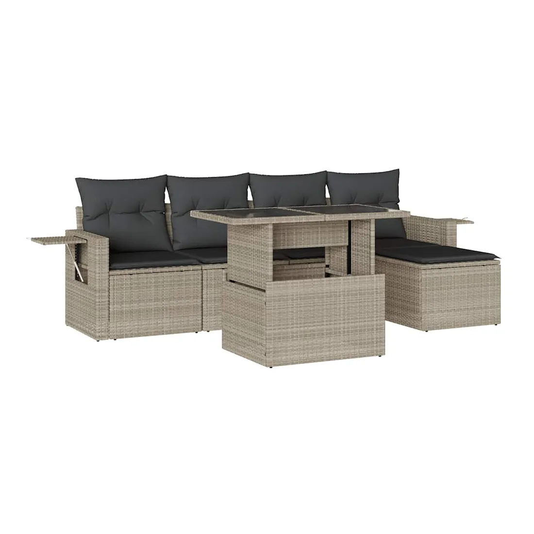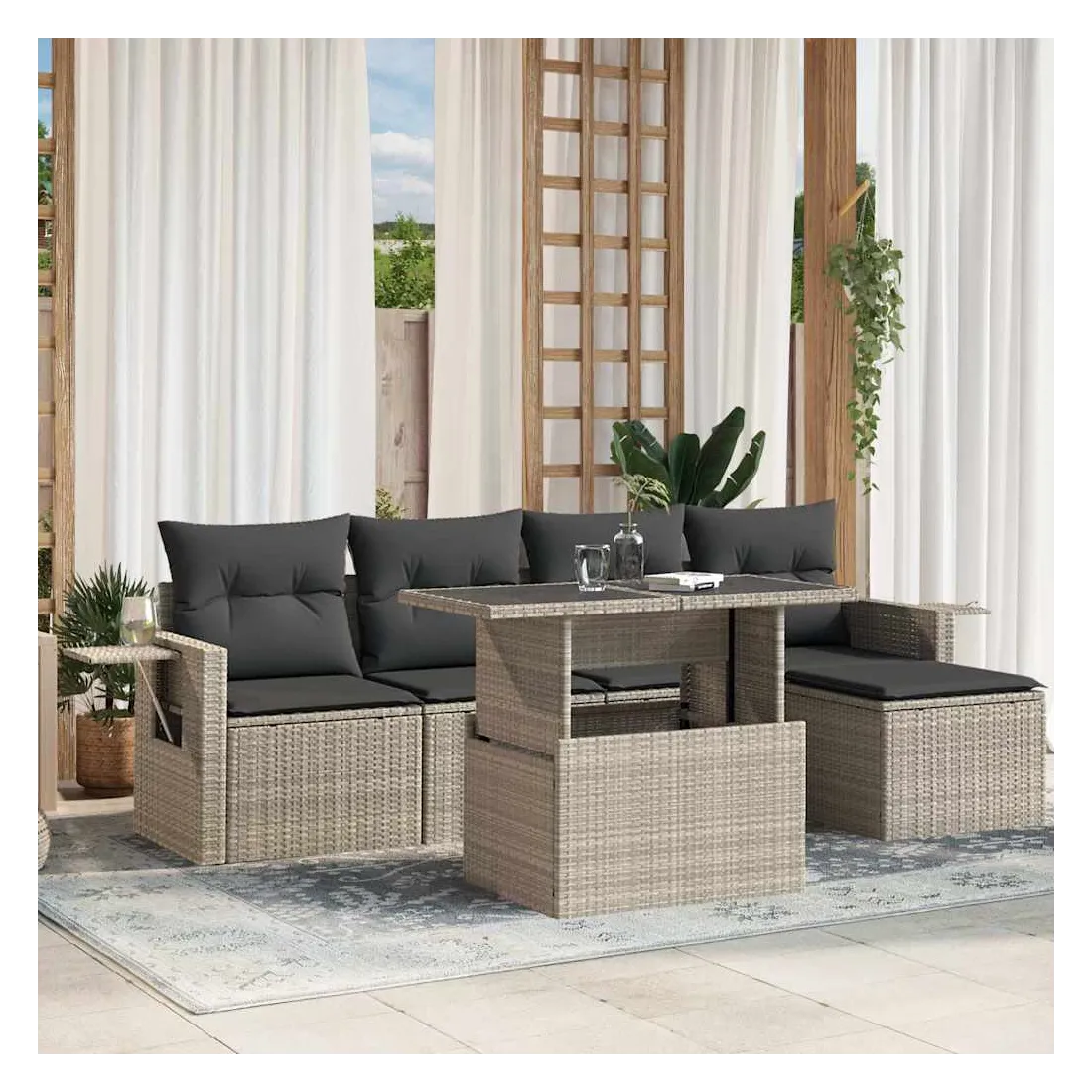 Cet ensemble de canapés de jardin est le complément parfait de votre arrière-cour, terrasse ou patio, offrant un espace confortable et accueillant pour discuter avec la famille et les amis ou simplement se détendre et profiter de l'extérieur. Matériau durable : la résine tressée, également connue sous le nom de poly rotin, est un matériau synthétique solide et nécessitant peu d'entretien qui ressemble au rotin naturel. Elle est légère, facile à nettoyer et couramment utilisée pour les meubles d'extérieur en raison de sa durabilité et de ses propriétés de résistance aux intempéries.Dessus de table réglable : le dessus de table peut être soulevé pour rendre la table plus haute, ce qui transforme la table d'extérieur d'une table basse à une table de salle à manger. Elle est parfaite pour recevoir des invités ou prendre des repas à l'extérieur.Table d'appoint pratique : ce mobilier d'extérieur comprend des tables d'appoint pliables avec un ressort à gaz sur les accoudoirs, offrant des endroits pratiques pour garder vos essentiels à portée de main. Expérience d'assise confortable : ce mobilier d'extérieur, doté de coussins épais, offre une expérience d'assise confortable.Conception modulaire : cet ensemble de meubles d'extérieur a une conception modulaire, ce qui le rend complètement flexible et facile à déplacer, afin que vous puissiez créer un agencement de meubles d'extérieur personnalisé. Bon à savoir :Pour que vos meubles d'extérieur restent beaux, nous vous recommandons de les protéger avec une housse imperméable.