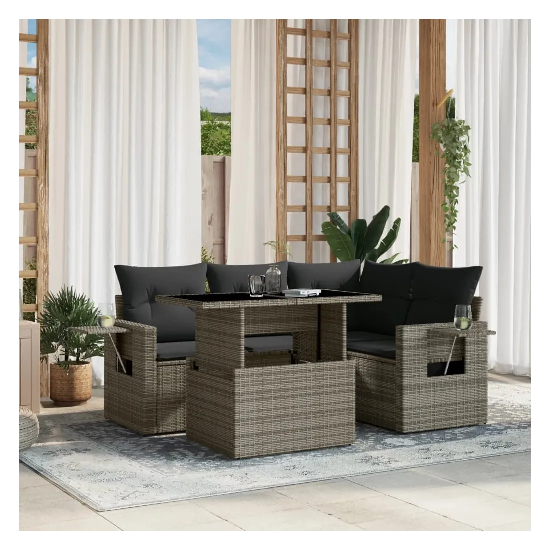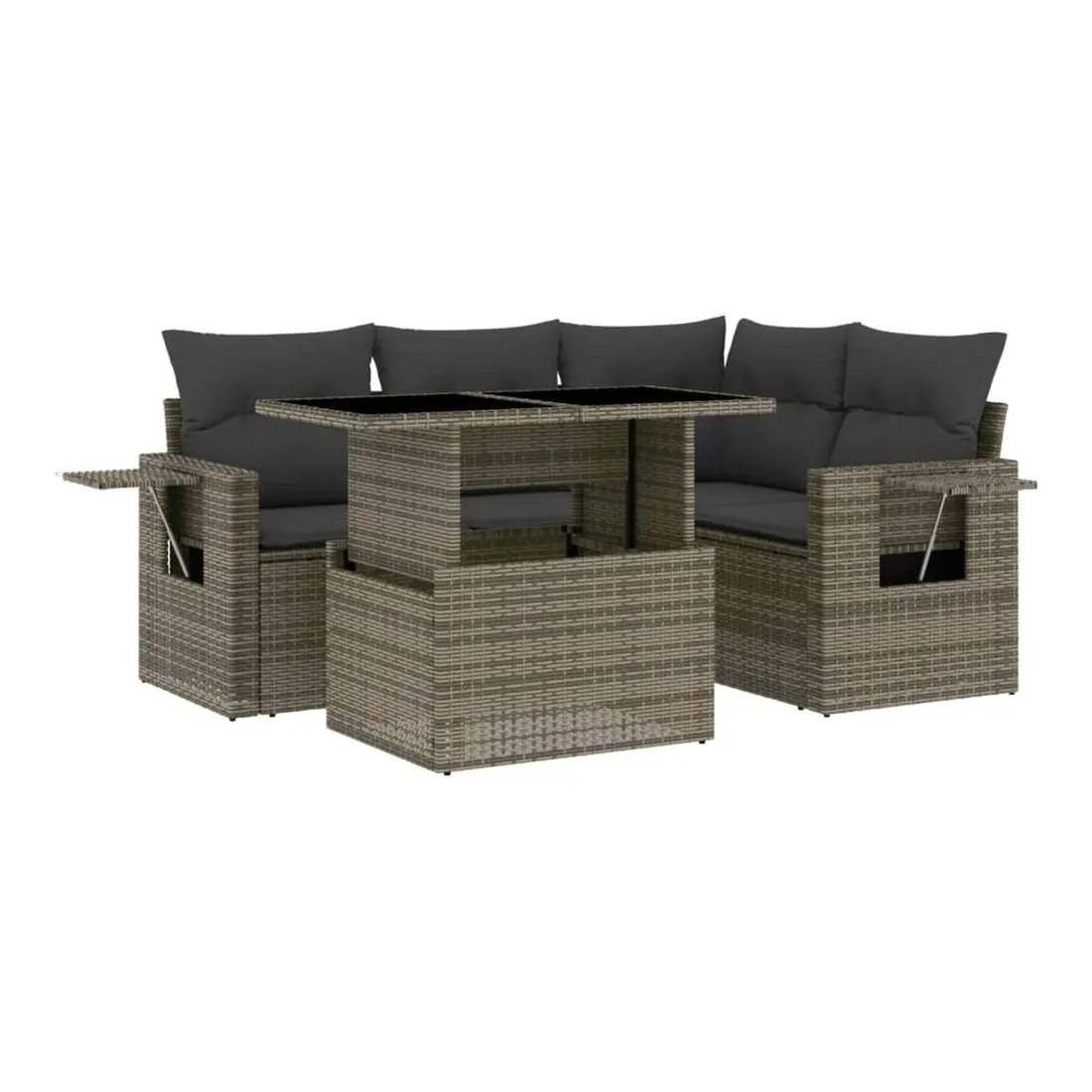 Cet ensemble de canapés de jardin est le complément parfait de votre arrière-cour, terrasse ou patio, offrant un espace confortable et accueillant pour discuter avec la famille et les amis ou simplement se détendre et profiter de l'extérieur. Matériau durable : la résine tressée, également connue sous le nom de poly rotin, est un matériau synthétique solide et nécessitant peu d'entretien qui ressemble au rotin naturel. Il est léger, facile à nettoyer et couramment utilisé pour les meubles d'extérieur en raison de sa durabilité et de ses propriétés de résistance aux intempéries.Dessus de table réglable : le dessus de table peut être soulevé pour rendre la table plus haute, ce qui transforme la table d'extérieur d'une table basse à une table de salle à manger. Elle est parfaite pour recevoir des invités ou prendre des repas à l'extérieur.Table d'appoint pratique : ce mobilier d'extérieur comprend des tables d'appoint pliables avec un ressort à gaz sur les accoudoirs, offrant des endroits pratiques pour garder vos essentiels à portée de main. Expérience d'assise confortable : ce mobilier d'extérieur, doté de coussins épais, offre une expérience d'assise confortable.Conception modulaire : cet ensemble de meubles d'extérieur a une conception modulaire, ce qui le rend complètement flexible et facile à déplacer, afin que vous puissiez créer un agencement de meubles d'extérieur personnalisé. Bon à savoir :Pour que vos meubles d'extérieur restent beaux, nous vous recommandons de les protéger avec une housse imperméable.
